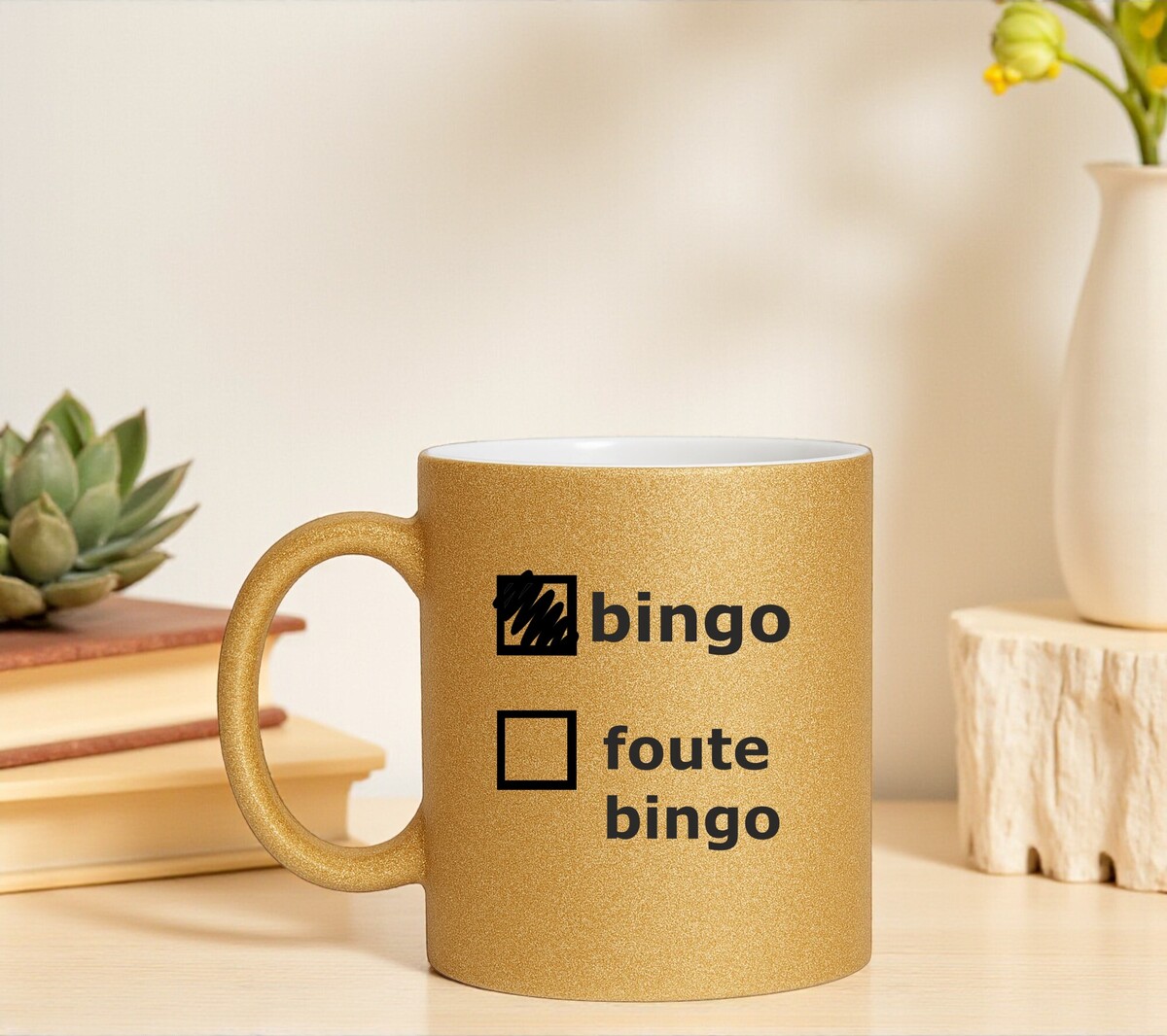 Speciaal ontworpen voor iedereen die houdt van glitter, humor en een tikkeltje over-the-top gezelligheid. Deze mok straalt pure bingo-glam uit met zijn luxe gouden look én de speelse tekst “Foute Bingo”. Het hoogtepunt? Het woord BINGO! staat trots aangekruist, alsof je élke ronde wint – zelfs voordat het spel begint.