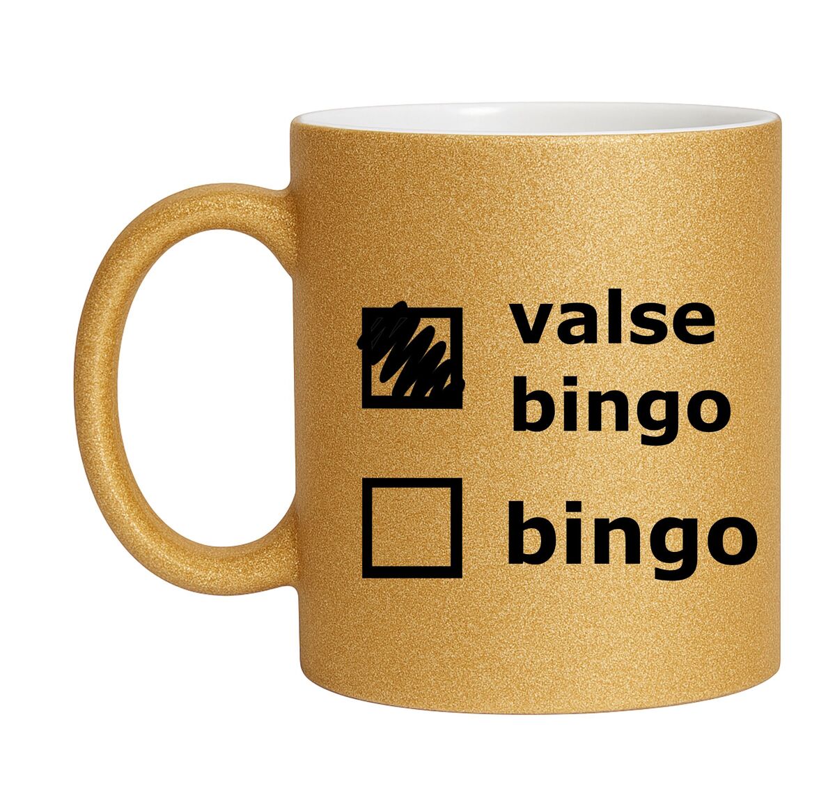 Gouden glitter mok valse bingo! Leuk om als prijs te geven op de bingo avond. Handwas aanbevolen! Microgolfbestendig. De mok is gemaakt van wit keramiek en is aan de buitenkant volledig bedekt met gouden glitters. De glitter mok heeft een hoogte van 96mm en een diameter van 80mm.