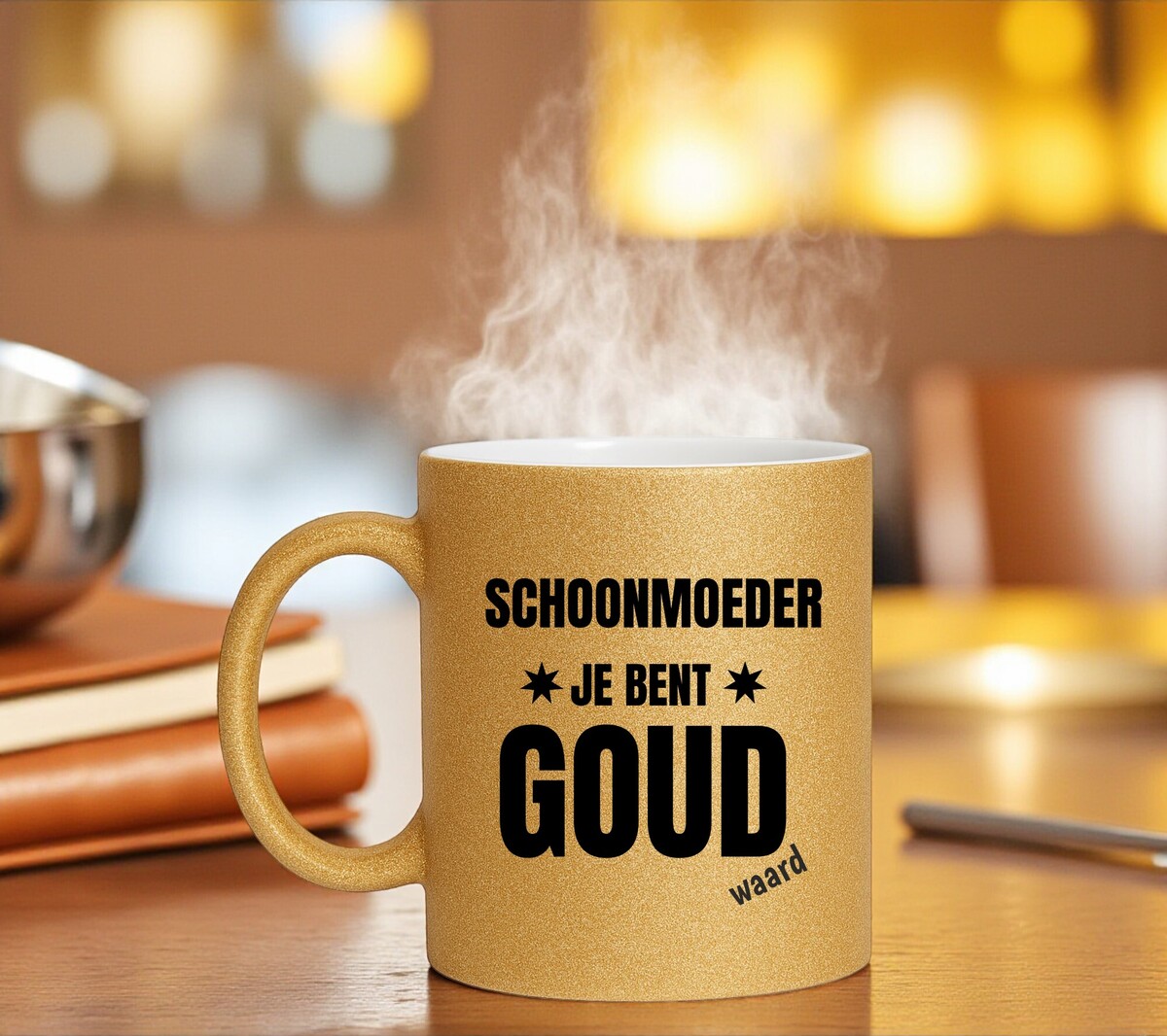 Gouden glitter koffie of thee mok schoonmoeder je bent goud waard. Handwas aanbevolen! Microgolfbestendig De gouden glitter mok heeft een hoogte van 96mm en een diameter van 80mm. De mok is gemaakt van wit keramiek en is aan de buitenkant volledig bedekt met gouden glitters.
