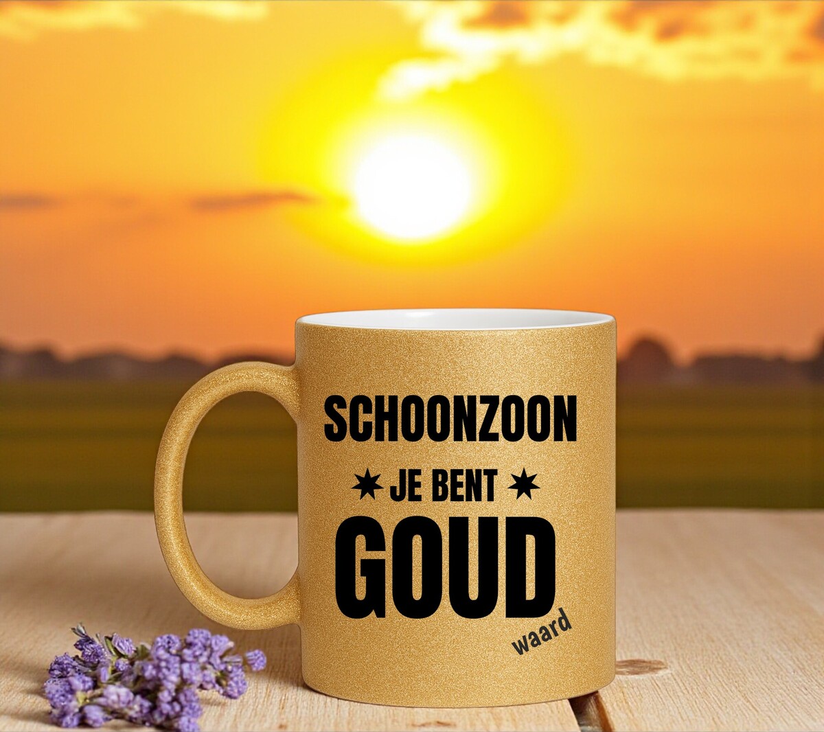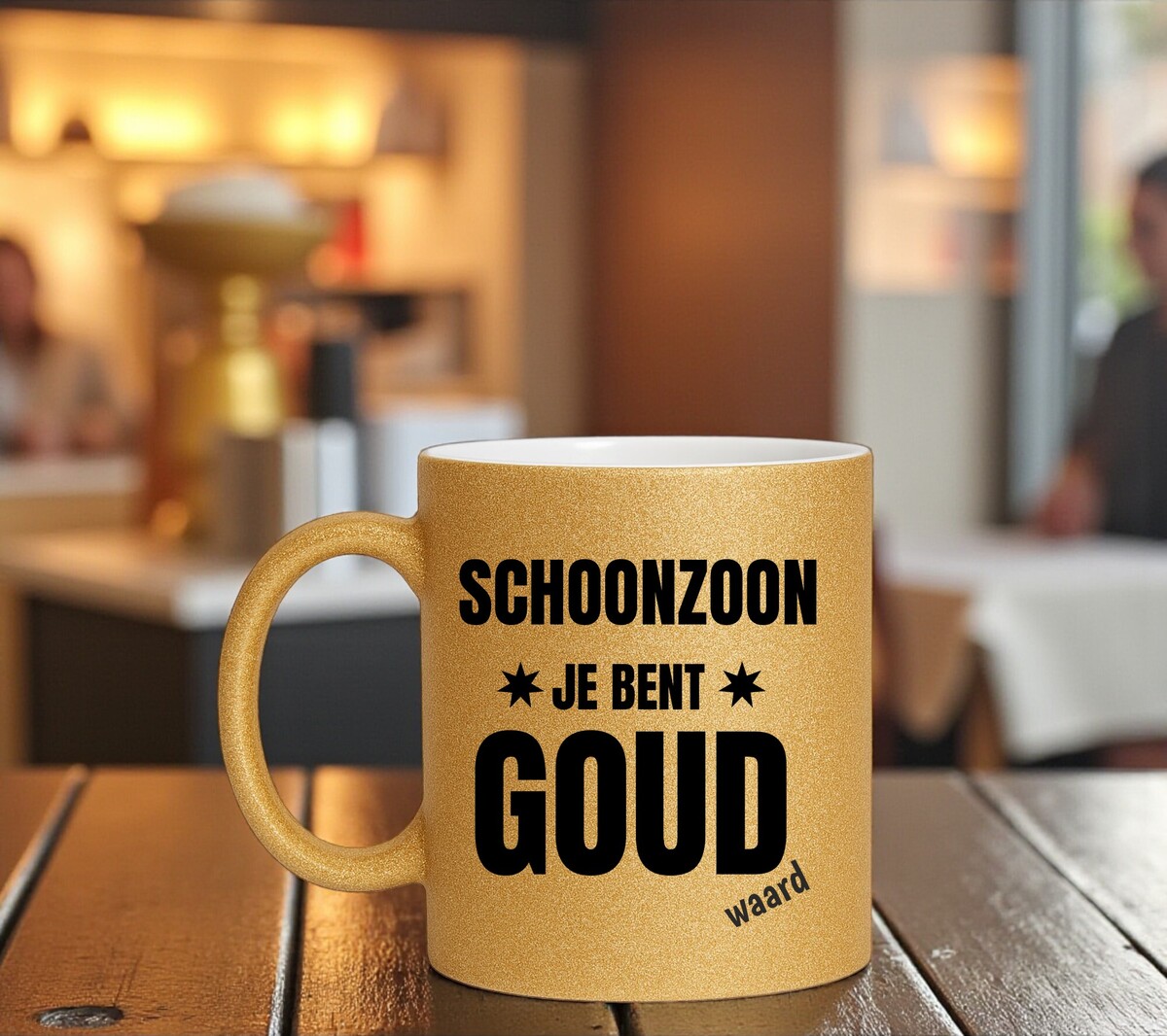 Gouden glitter mok schoonzoon je bent goud waard. Handwas aanbevolen! Microgolfbestendig De gouden glitter mok heeft een hoogte van 96mm en een diameter van 80mm. De mok is gemaakt van wit keramiek en is aan de buitenkant volledig bedekt met gouden glitters.