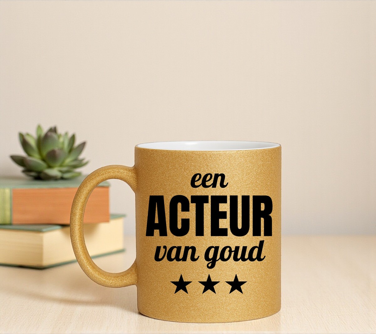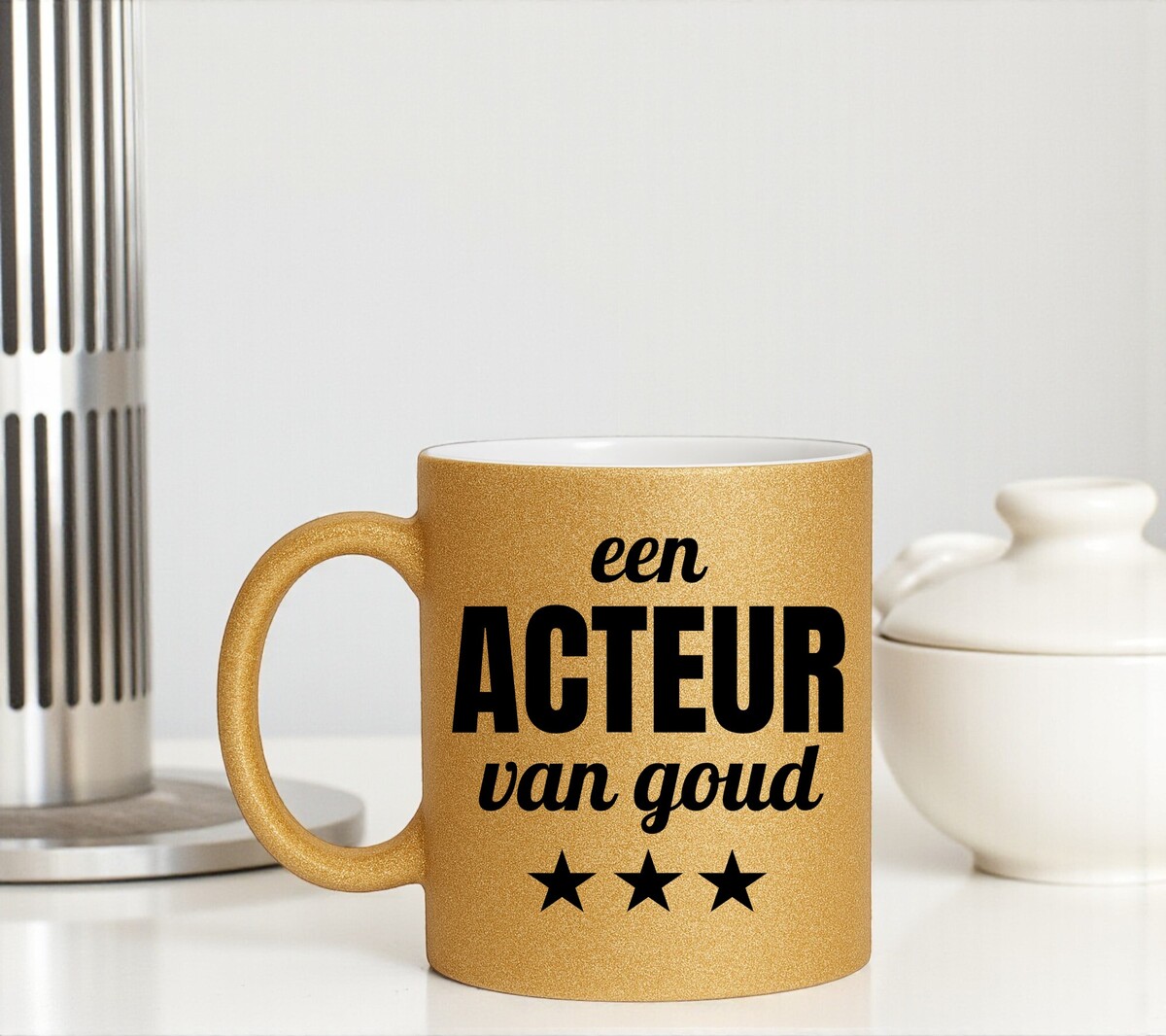 Een prachtig kado voor een acteur van goud! Erg Leuk om de gouden glitter mok cadeau te geven.