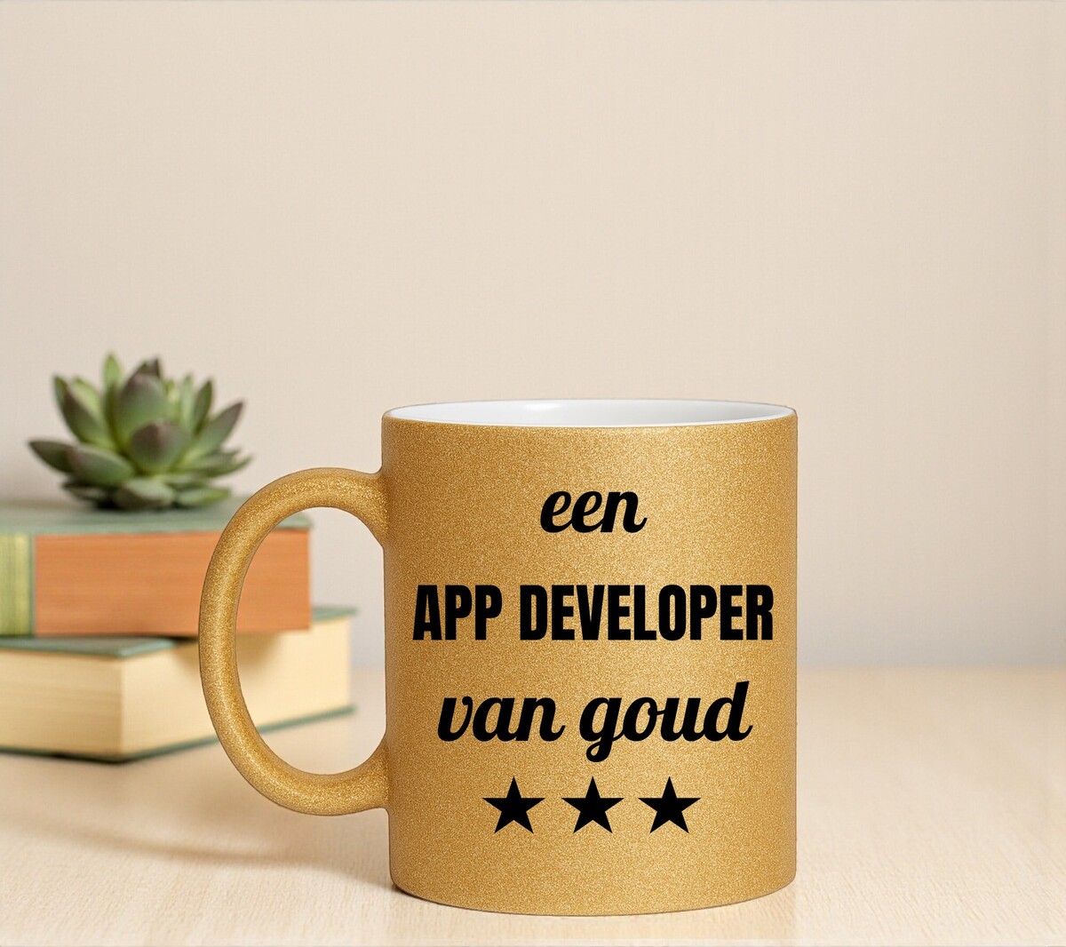 Een prachtig kado voor een app developer van goud! Erg Leuk om de gouden glitter mok cadeau te geven. De mok is gemaakt van wit keramiek en is aan de buitenkant volledig bedekt met gouden glitters.