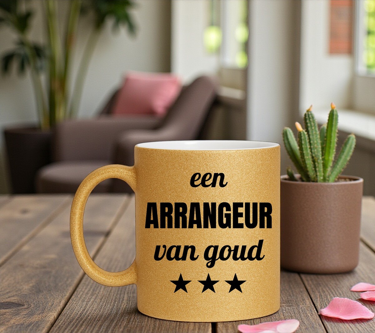 Een prachtig kado voor een arrangeur van goud! Erg Leuk om de gouden glitter mok cadeau te geven. De mok is gemaakt van wit keramiek en is aan de buitenkant volledig bedekt met gouden glitters.