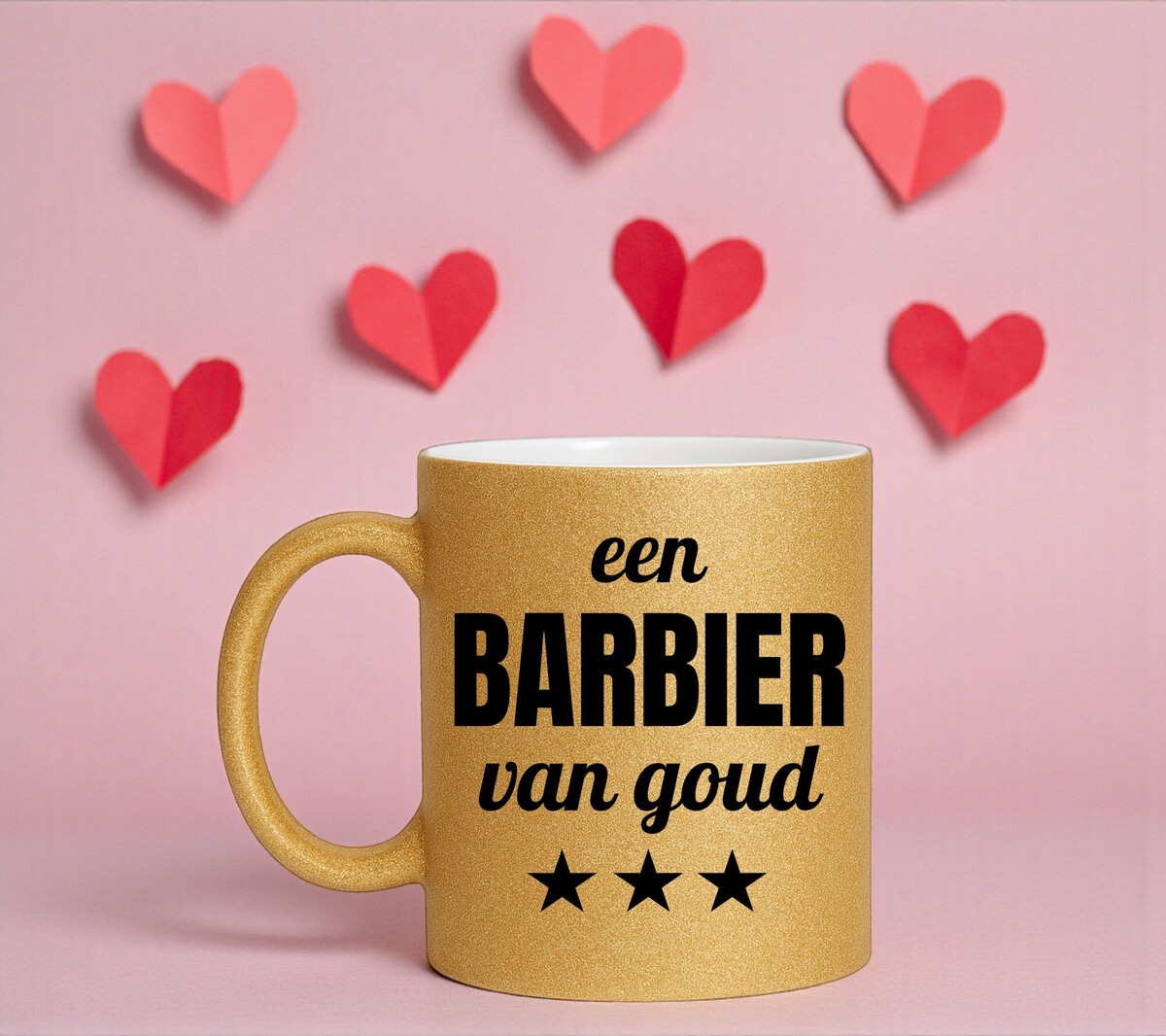 Een prachtig kado voor een barbier van goud! Erg Leuk om de gouden glitter mok cadeau te geven. De mok is gemaakt van wit keramiek en is aan de buitenkant volledig bedekt met gouden glitters.