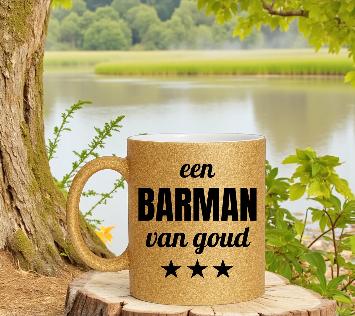 Een prachtig kado voor een barman van goud! Erg Leuk om de gouden glitter mok cadeau te geven. De mok is gemaakt van wit keramiek en is aan de buitenkant volledig bedekt met gouden glitters.