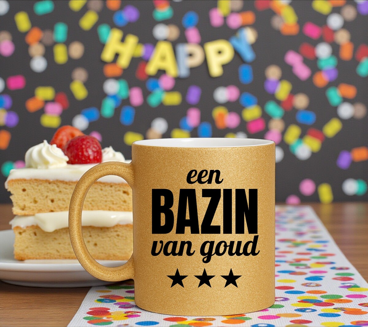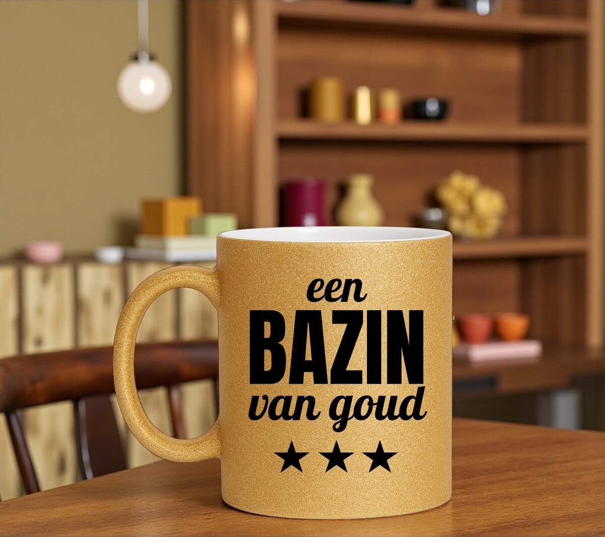Een prachtig kado voor een bazin van goud! Erg Leuk om de gouden glitter mok cadeau te geven. De mok is gemaakt van wit keramiek en is aan de buitenkant volledig bedekt met gouden glitters.