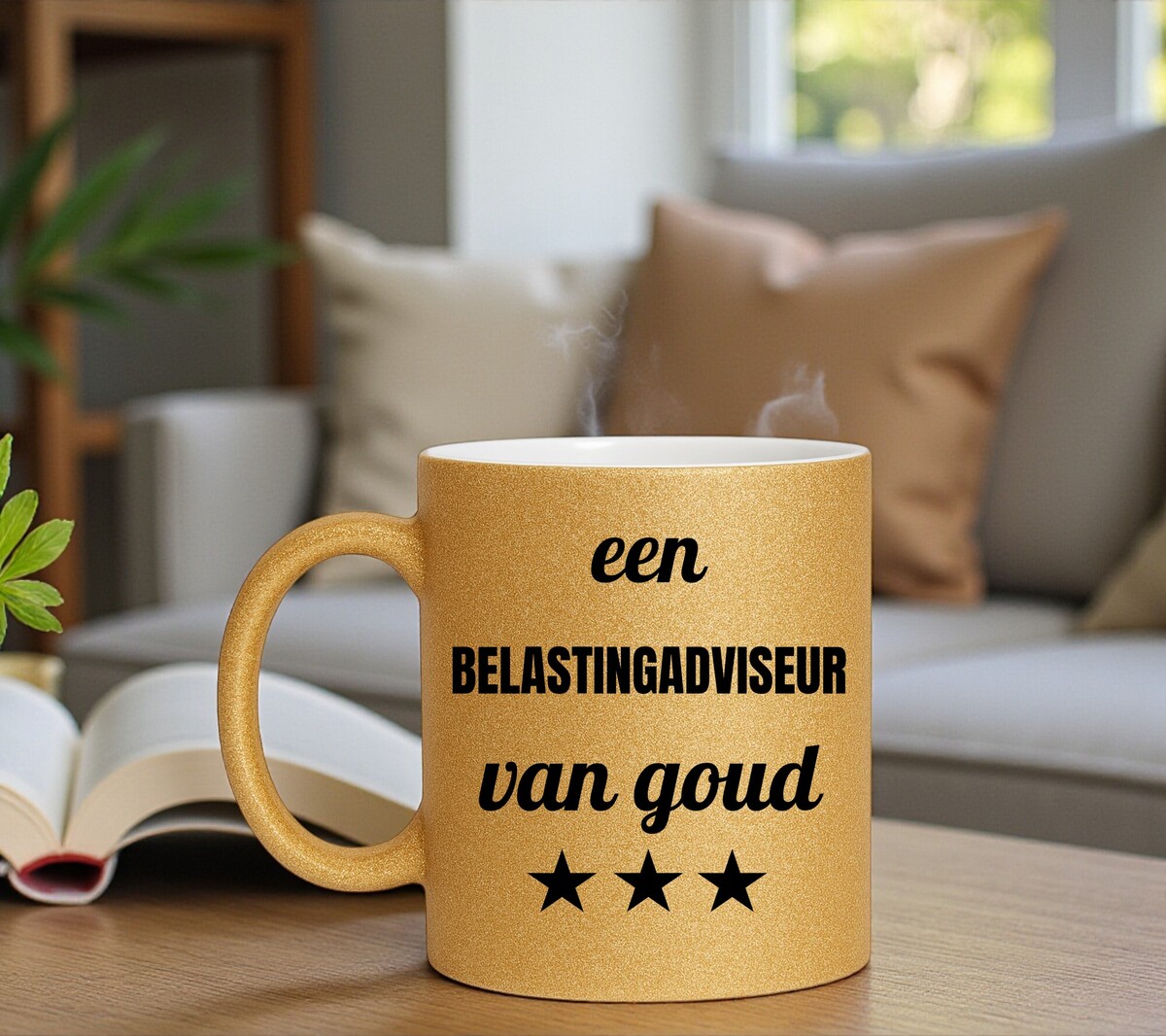 Een prachtig kado voor een belastingadviseur van goud! Erg Leuk om de gouden glitter mok cadeau te geven. De mok is gemaakt van wit keramiek en is aan de buitenkant volledig bedekt met gouden glitters.