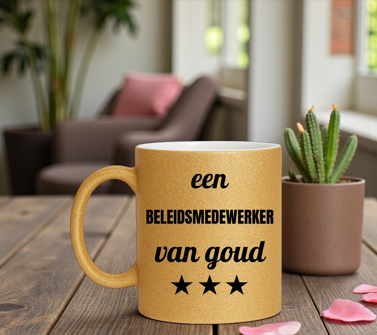 Een prachtig kado voor een beleidsmedewerker van goud! Erg Leuk om de gouden glitter mok cadeau te geven. De mok is gemaakt van wit keramiek en is aan de buitenkant volledig bedekt met gouden glitters.