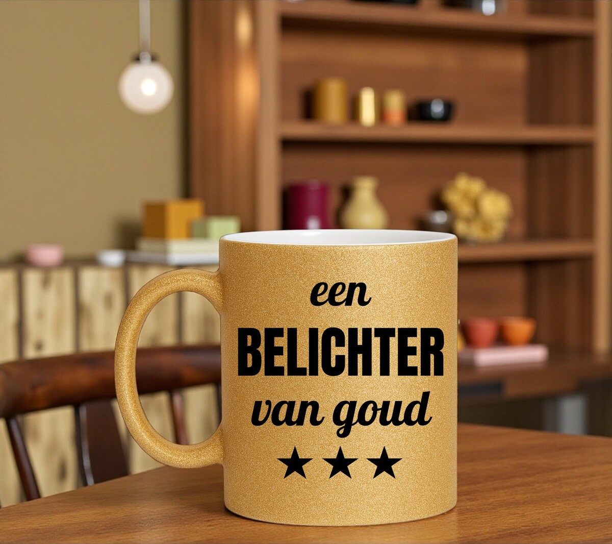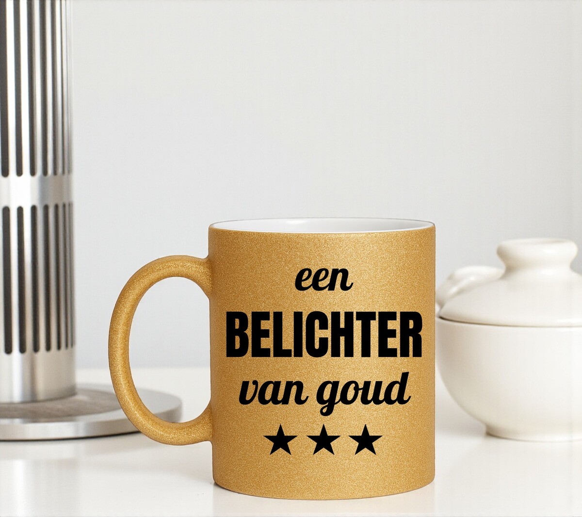 Een prachtig kado voor een belichter van goud! Erg Leuk om de gouden glitter mok cadeau te geven.