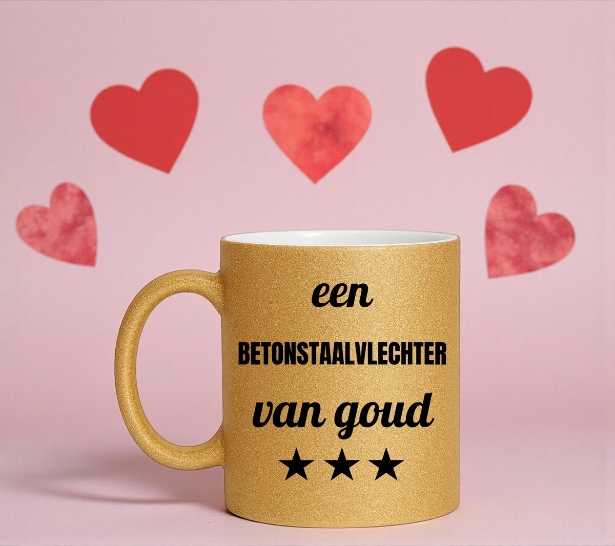 Een prachtig kado voor een betonstaalvlechter van goud! Erg Leuk om de gouden glitter mok cadeau te geven. De mok is gemaakt van wit keramiek en is aan de buitenkant volledig bedekt met gouden glitters.