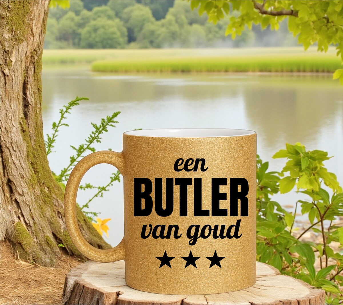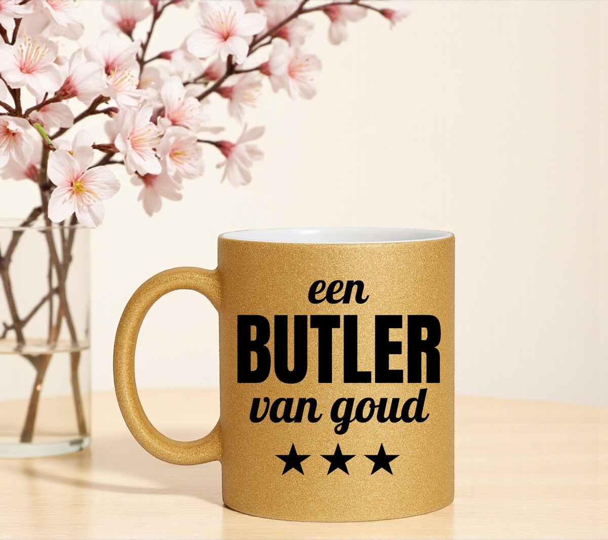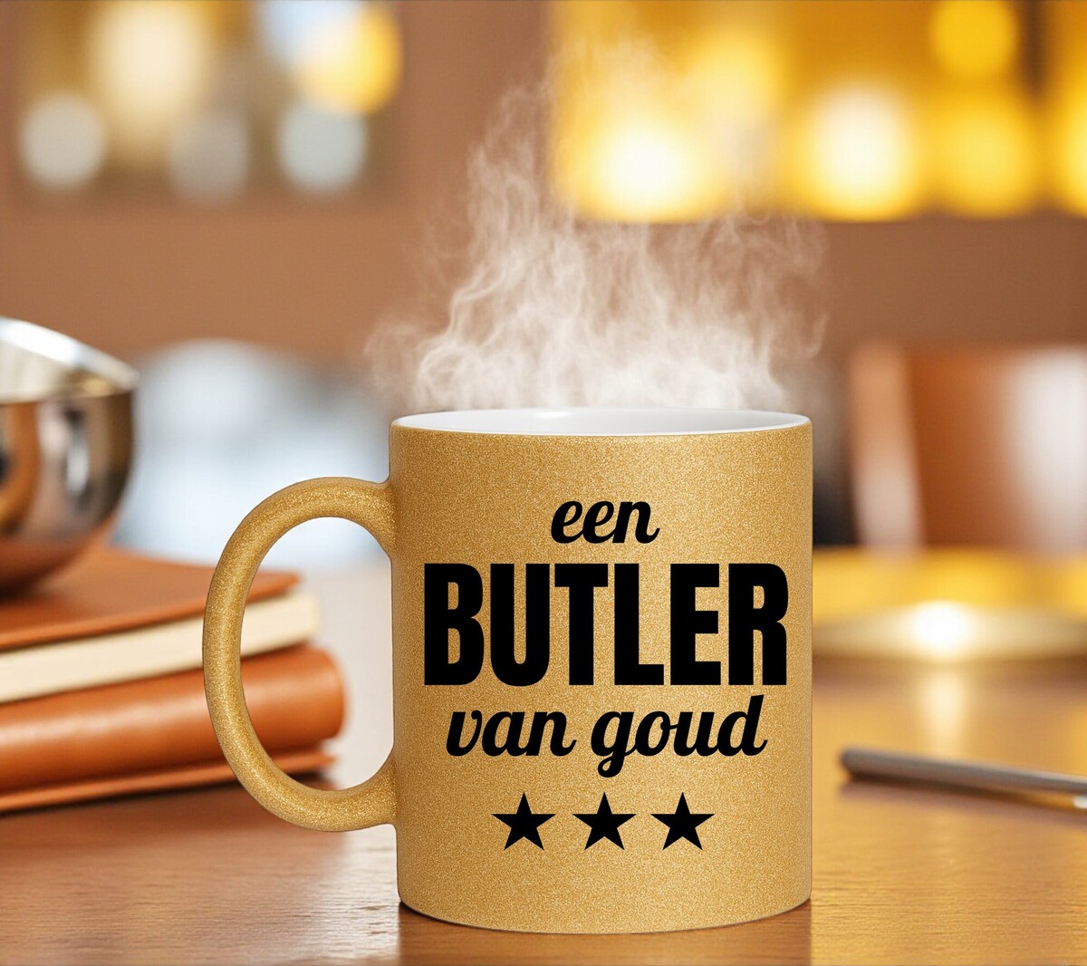 Een prachtig kado voor een butler van goud! Erg Leuk om de gouden glitter mok cadeau te geven. De mok is gemaakt van wit keramiek en is aan de buitenkant volledig bedekt met gouden glitters.