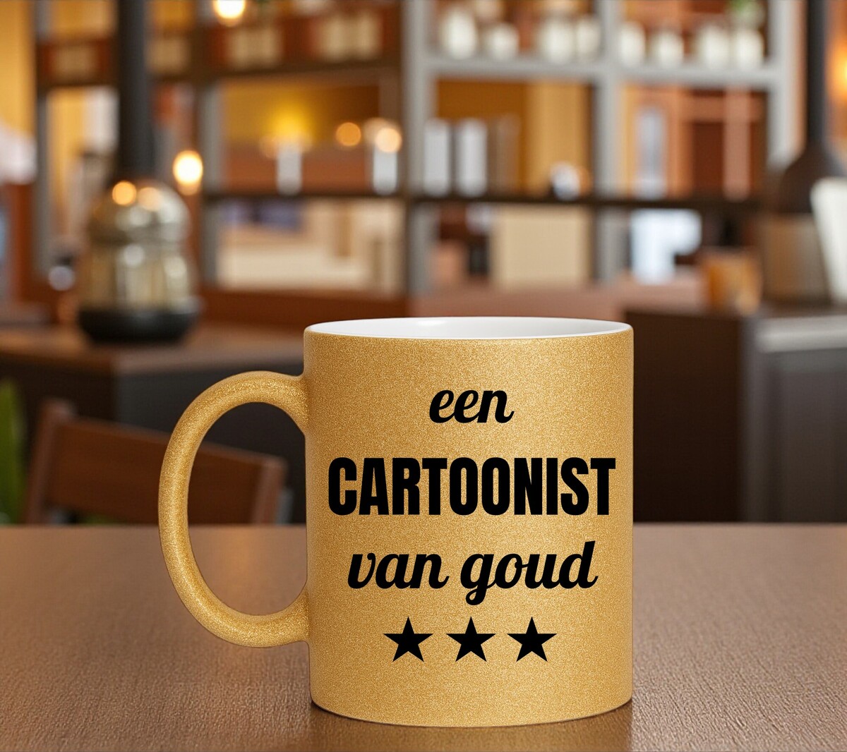 Een prachtig kado voor een cartoonist van goud! Erg Leuk om de gouden glitter mok cadeau te geven. De mok is gemaakt van wit keramiek en is aan de buitenkant volledig bedekt met gouden glitters.