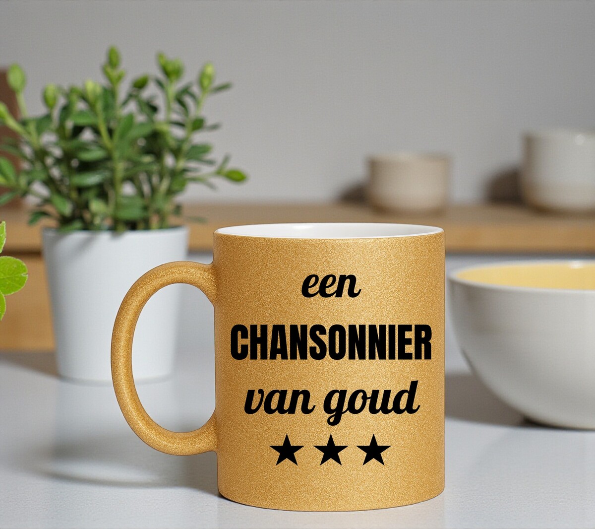 Een prachtig kado voor een chansonnier van goud! Erg Leuk om de gouden glitter mok cadeau te geven. De mok is gemaakt van wit keramiek en is aan de buitenkant volledig bedekt met gouden glitters.