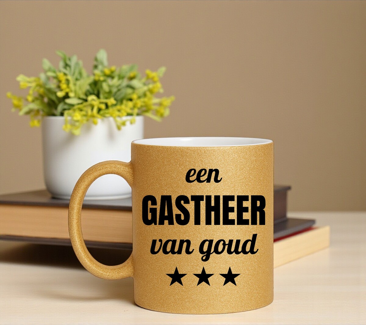 Een prachtig kado voor een gastheer van goud! Erg Leuk om de gouden glitter mok cadeau te geven. De mok is gemaakt van wit keramiek en is aan de buitenkant volledig bedekt met gouden glitters.