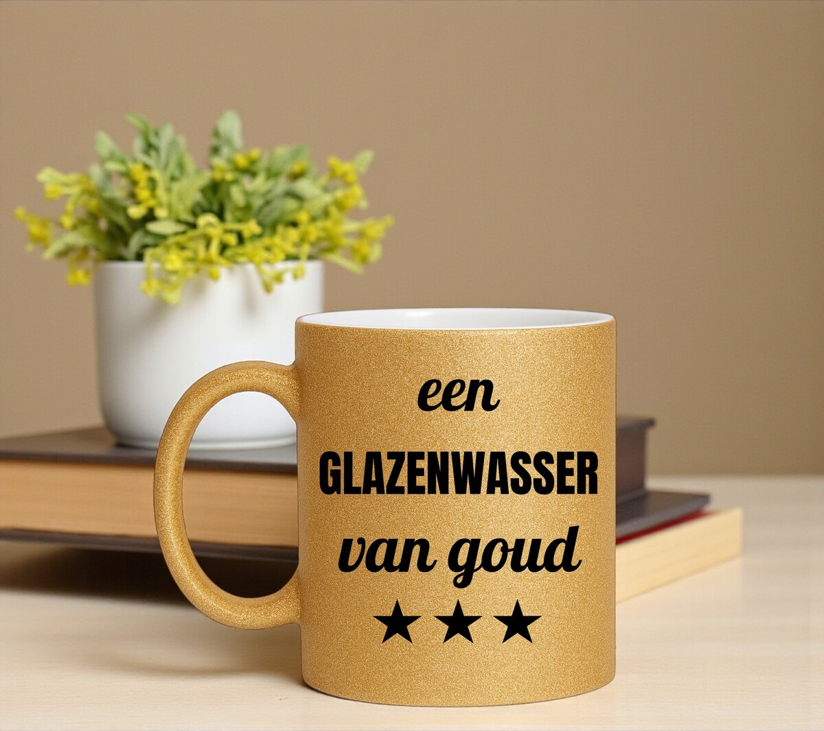Een prachtig kado voor een glazenwasser van goud! Erg Leuk om de gouden glitter mok cadeau te geven. De mok is gemaakt van wit keramiek en is aan de buitenkant volledig bedekt met gouden glitters.