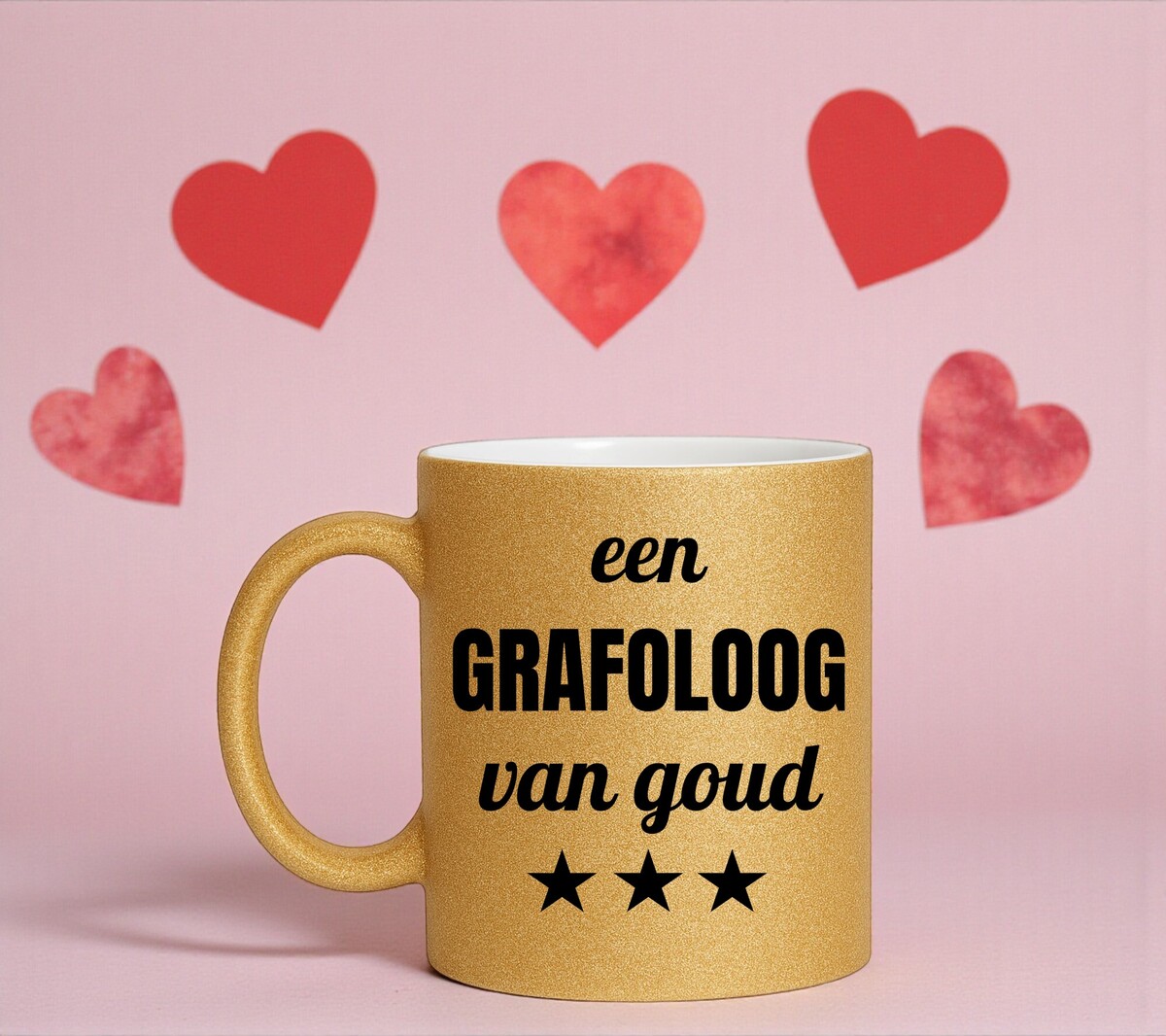 Een prachtig kado voor een grafoloog van goud! Erg Leuk om de gouden glitter mok cadeau te geven. De mok is gemaakt van wit keramiek en is aan de buitenkant volledig bedekt met gouden glitters.
