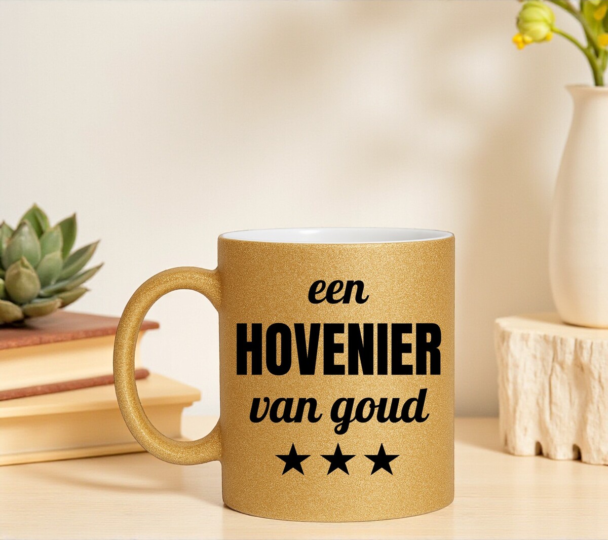Een prachtig kado voor een hovenier van goud! Erg Leuk om de gouden glitter mok cadeau te geven. De mok is gemaakt van wit keramiek en is aan de buitenkant volledig bedekt met gouden glitters.