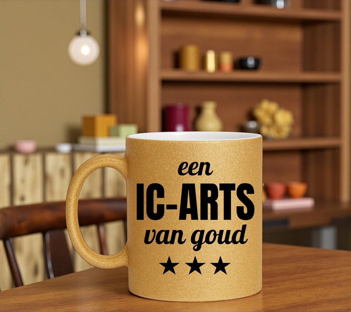 Een prachtig kado voor een ic-arts van goud! Erg Leuk om de gouden glitter mok cadeau te geven. De mok is gemaakt van wit keramiek en is aan de buitenkant volledig bedekt met gouden glitters.