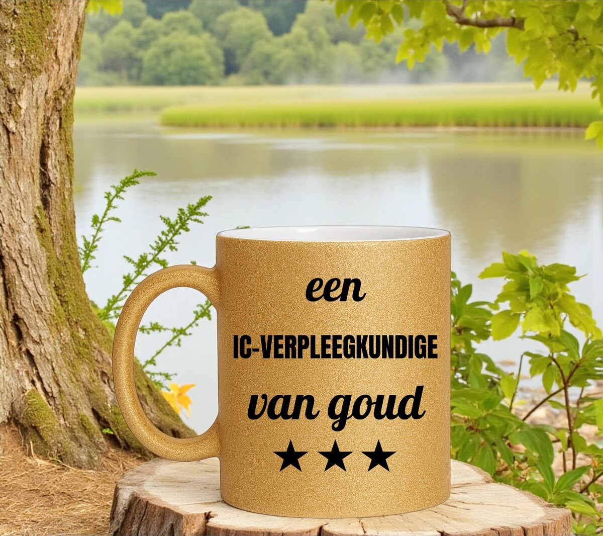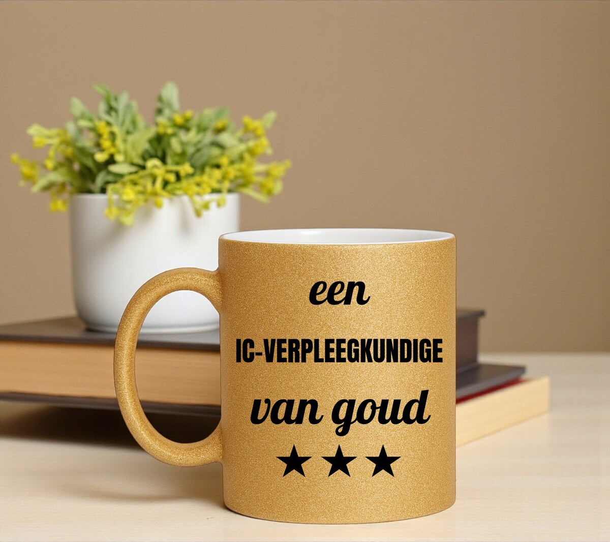 Een prachtig kado voor een ic-verpleegkundige van goud! Erg Leuk om de gouden glitter mok cadeau te geven. De mok is gemaakt van wit keramiek en is aan de buitenkant volledig bedekt met gouden glitters.
