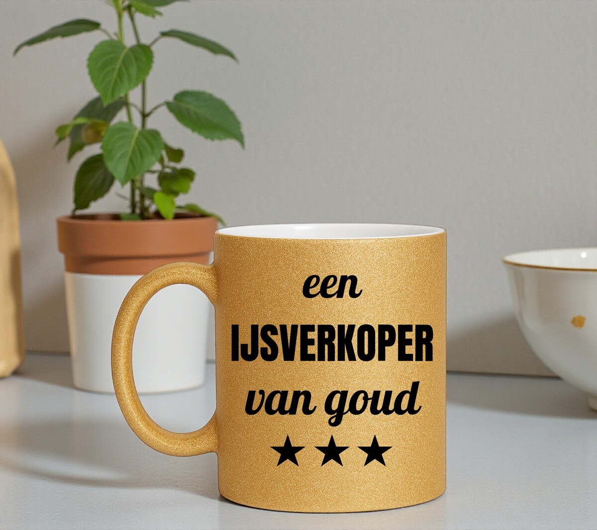 Een prachtig kado voor een ijsverkoper van goud! Erg Leuk om de gouden glitter mok cadeau te geven. De mok is gemaakt van wit keramiek en is aan de buitenkant volledig bedekt met gouden glitters.