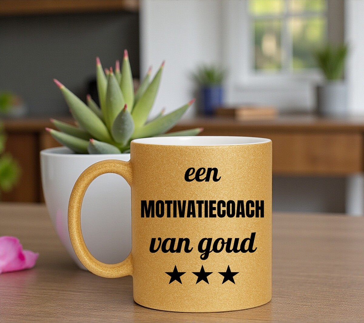 Een prachtig kado voor een motivatiecoach van goud! Erg Leuk om de gouden glitter mok cadeau te geven. De mok is gemaakt van wit keramiek en is aan de buitenkant volledig bedekt met gouden glitters.