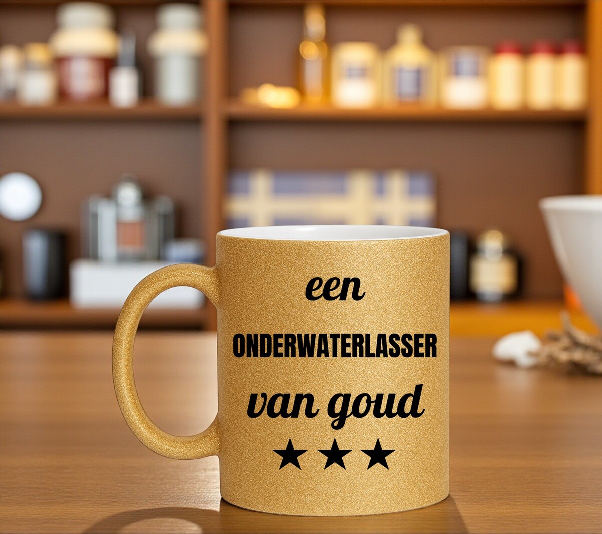 Een prachtig kado voor een onderwaterlasser van goud! Erg Leuk om de gouden glitter mok cadeau te geven. De mok is gemaakt van wit keramiek en is aan de buitenkant volledig bedekt met gouden glitters.