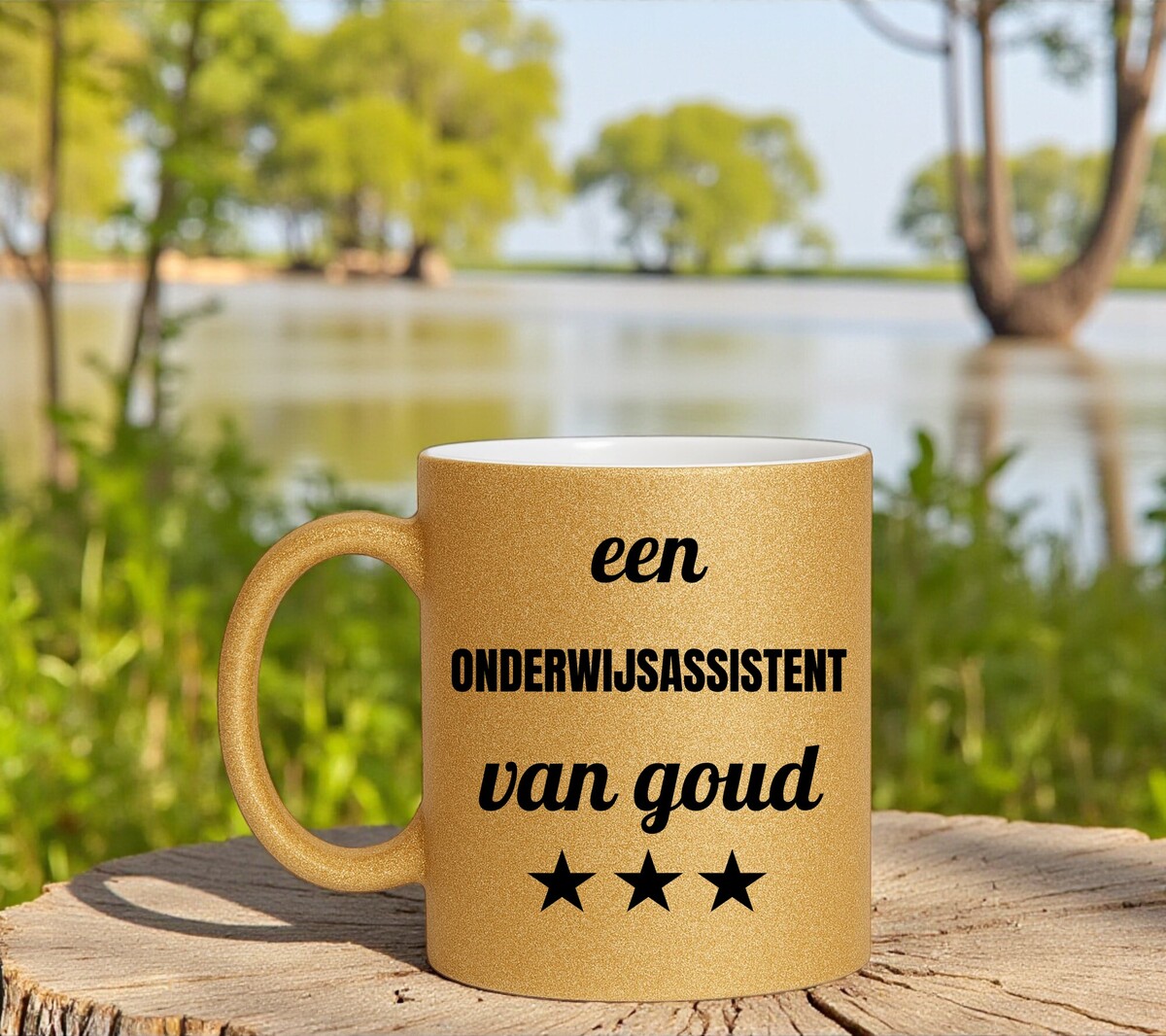 Een prachtig kado voor een onderwijsassistent van goud! Erg Leuk om de gouden glitter mok cadeau te geven.