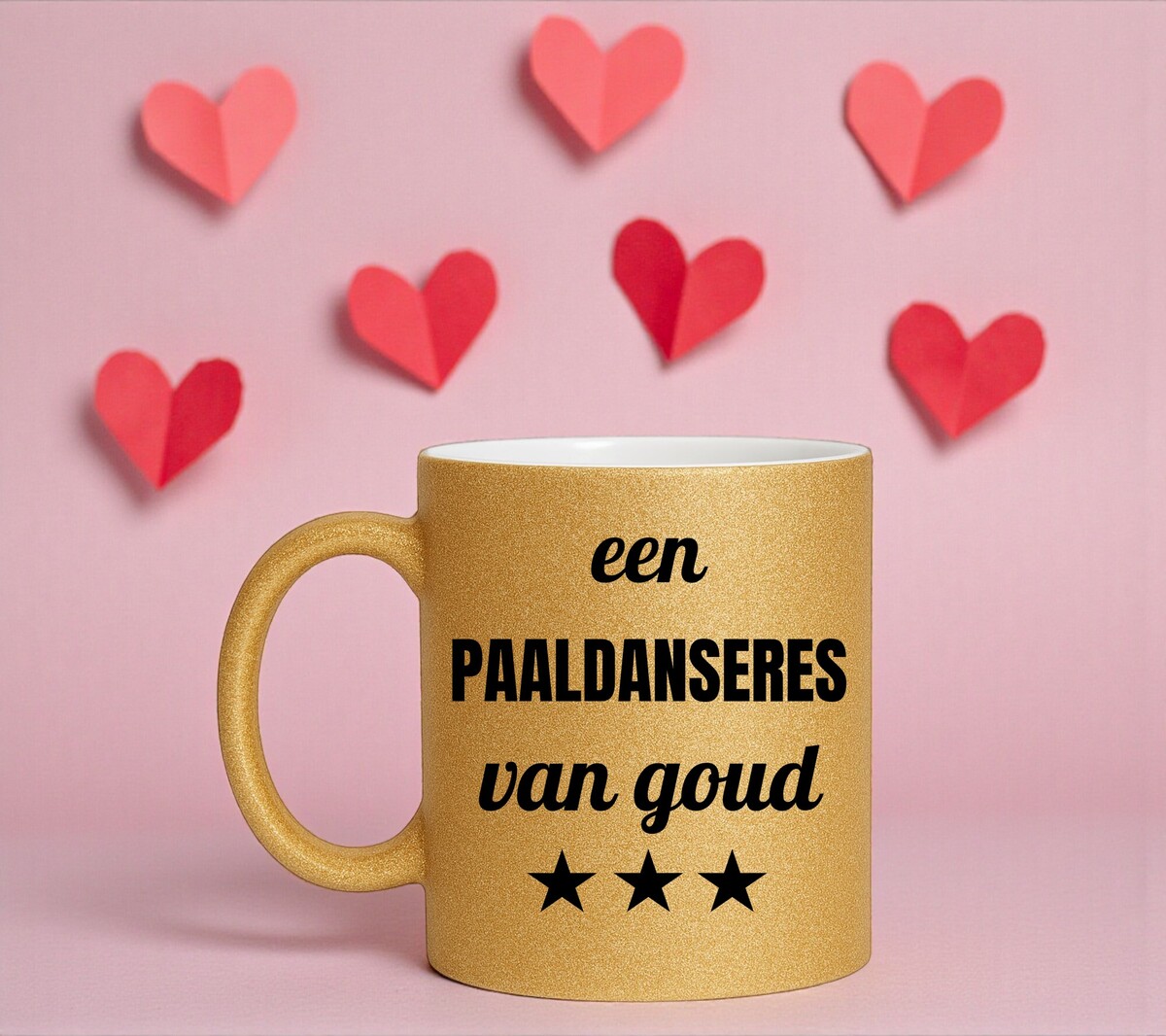 Een prachtig kado voor een paaldanseres van goud! Erg Leuk om de gouden glitter mok cadeau te geven. De mok is gemaakt van wit keramiek en is aan de buitenkant volledig bedekt met gouden glitters.