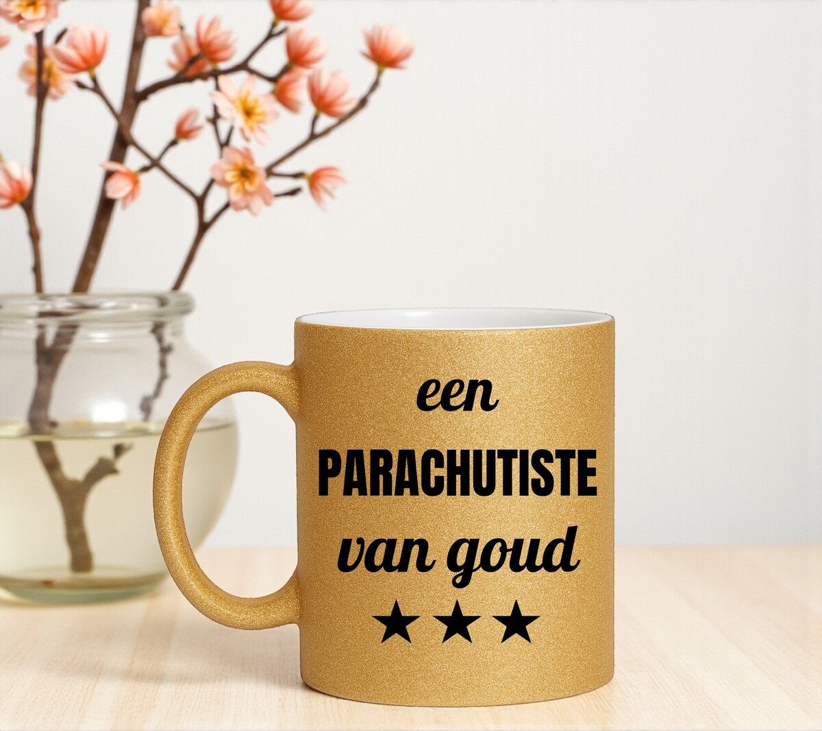 Een prachtig kado voor een parachutiste van goud! Erg Leuk om de gouden glitter mok cadeau te geven.