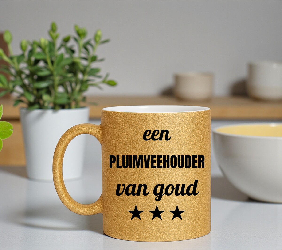 Een prachtig kado voor een pluimveehouder van goud! Erg Leuk om de gouden glitter mok cadeau te geven. De mok is gemaakt van wit keramiek en is aan de buitenkant volledig bedekt met gouden glitters.