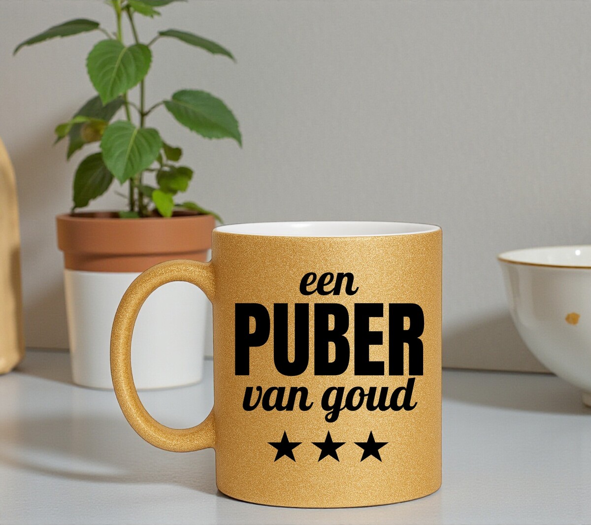 Een prachtig kado voor een puber van goud! Erg Leuk om de gouden glitter mok cadeau te geven. De mok is gemaakt van wit keramiek en is aan de buitenkant volledig bedekt met gouden glitters.