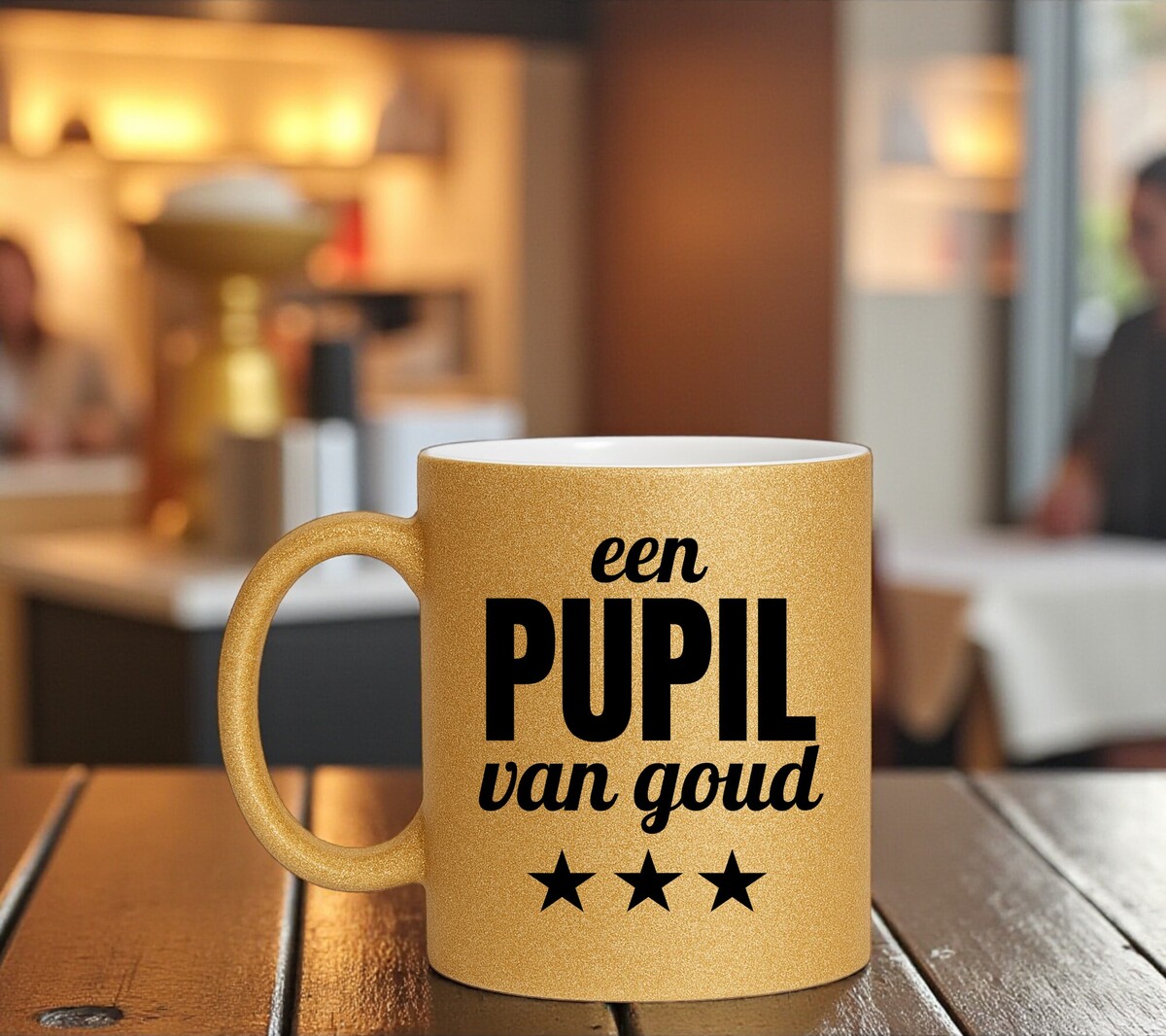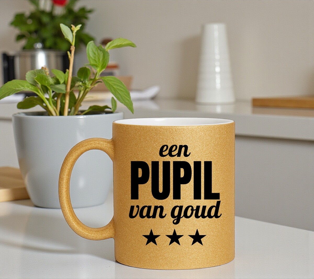 Een prachtig kado voor een pupil van goud! Erg Leuk om de gouden glitter mok cadeau te geven. De mok is gemaakt van wit keramiek en is aan de buitenkant volledig bedekt met gouden glitters.