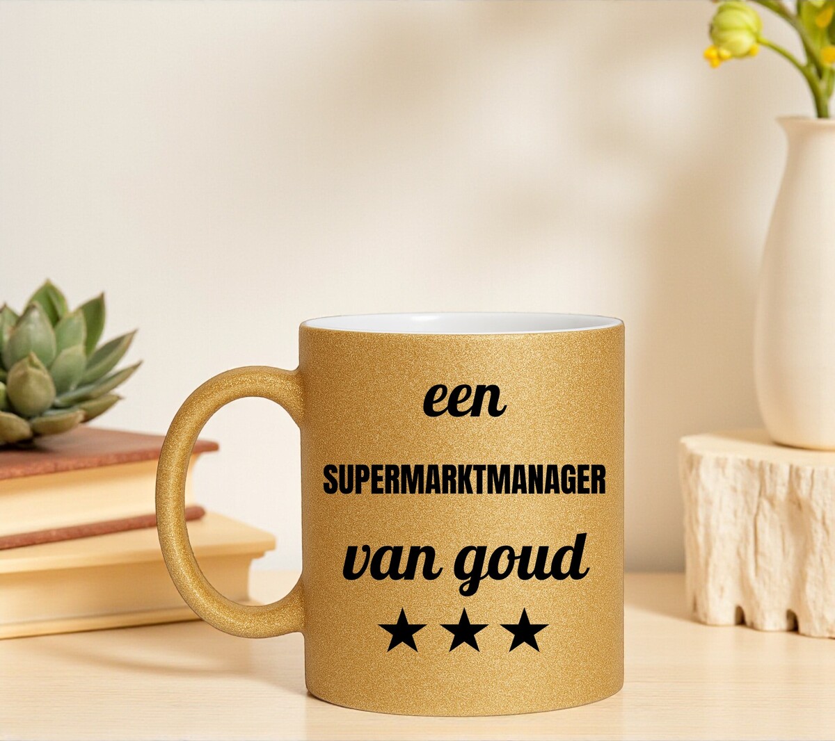 Een prachtig kado voor een supermarktmanager van goud! Erg Leuk om de gouden glitter mok cadeau te geven.