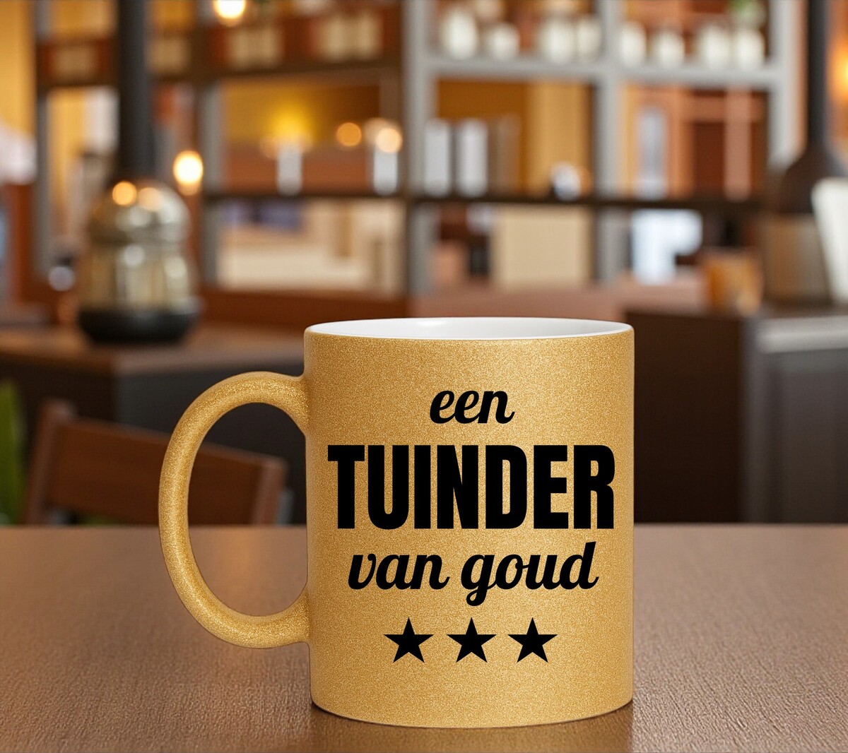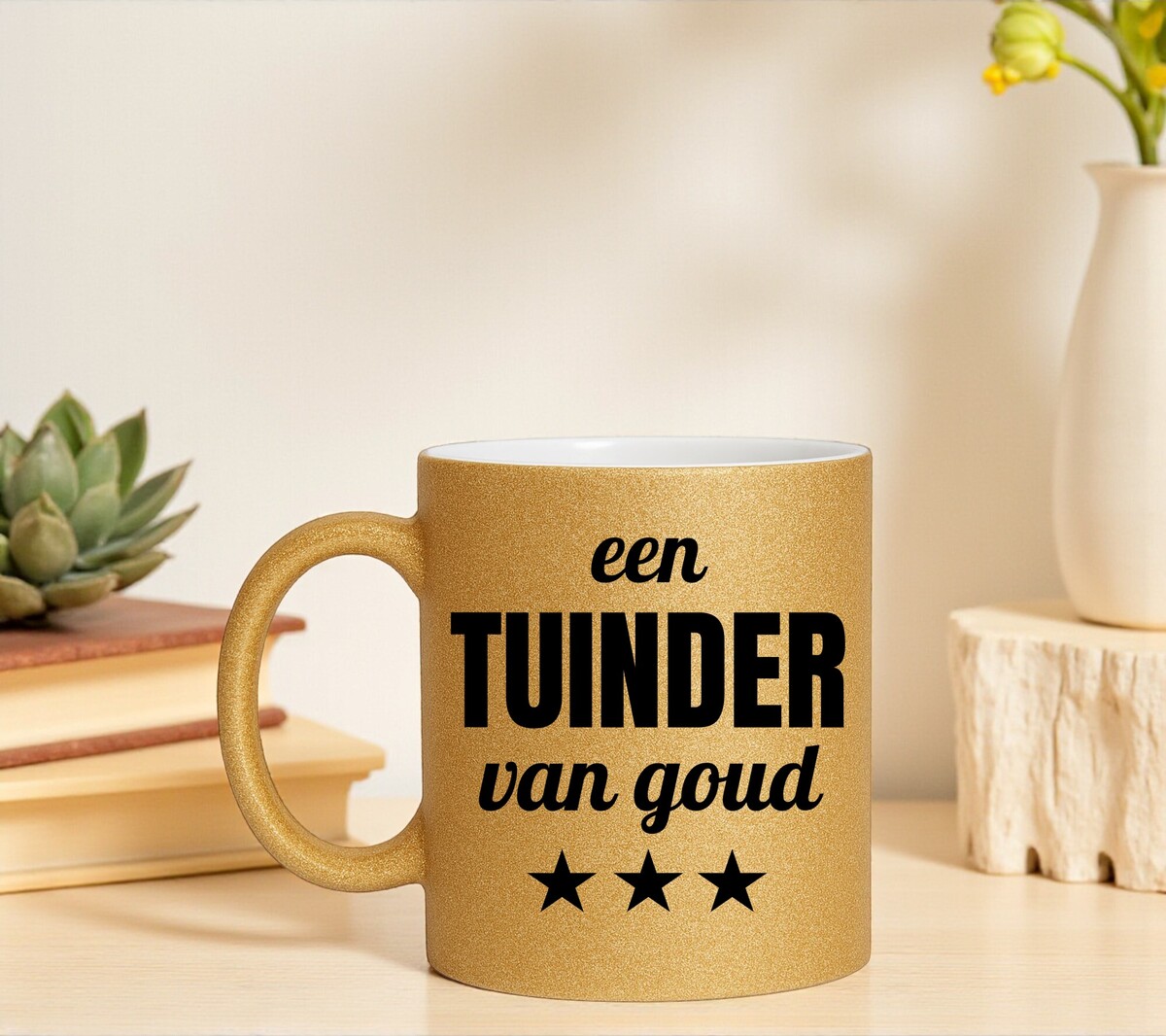 Een prachtig kado voor een tuinder van goud! Erg Leuk om de gouden glitter mok cadeau te geven. De mok is gemaakt van wit keramiek en is aan de buitenkant volledig bedekt met gouden glitters.