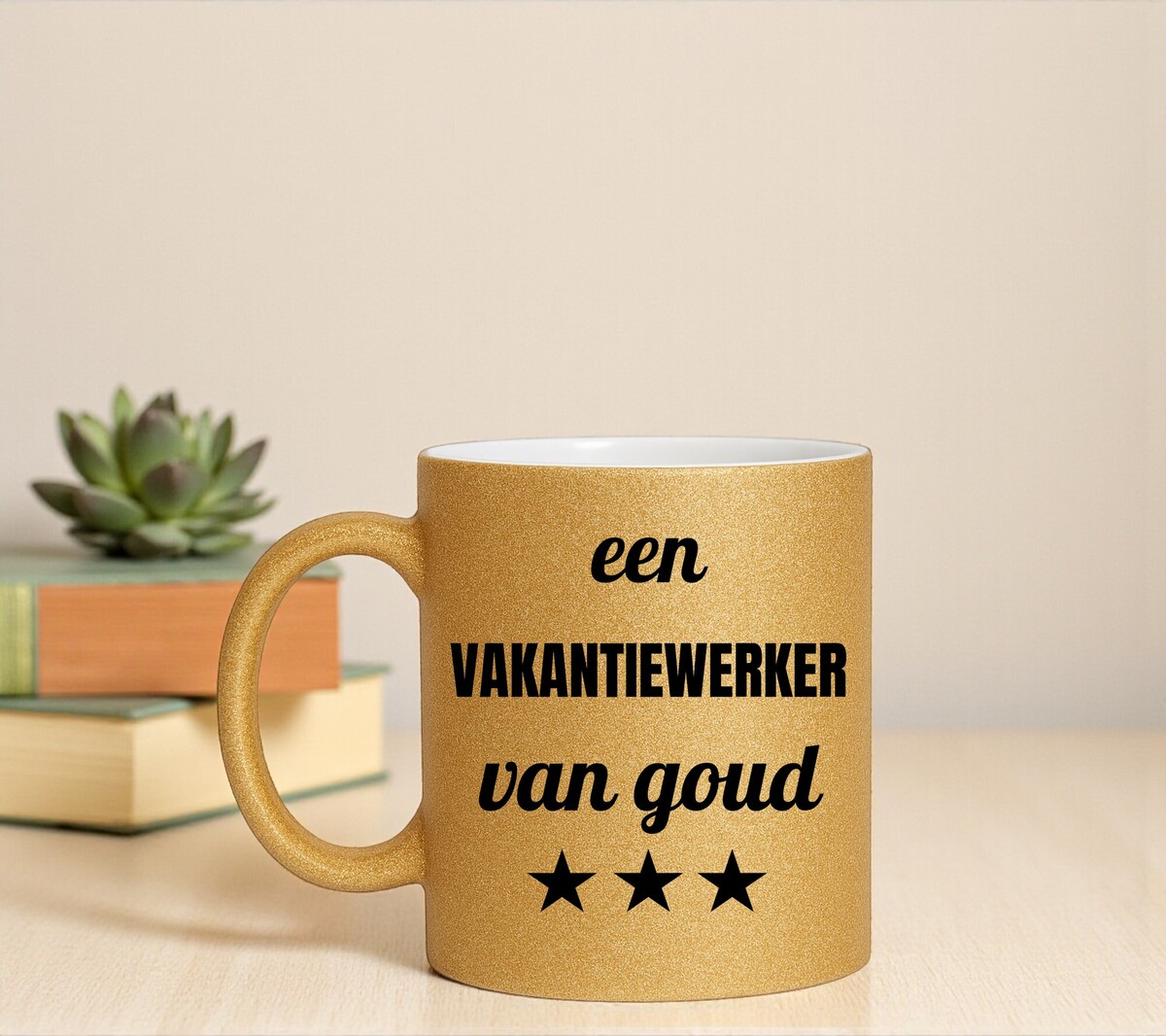 Een prachtig kado voor een vakantiewerker van goud! Erg Leuk om de gouden glitter mok cadeau te geven. De mok is gemaakt van wit keramiek en is aan de buitenkant volledig bedekt met gouden glitters.
