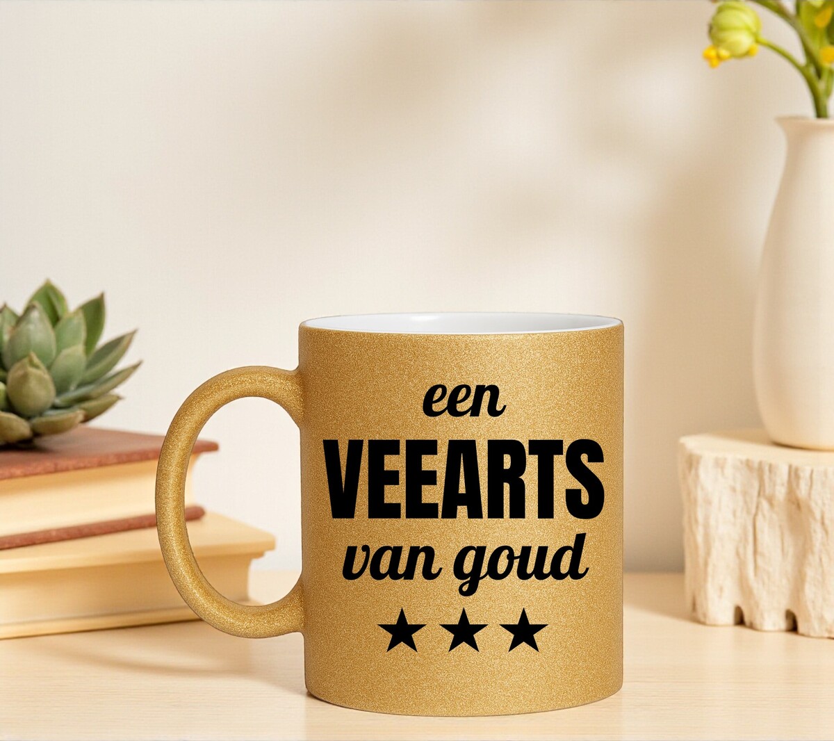 Een prachtig kado voor een veearts van goud! Erg Leuk om de gouden glitter mok cadeau te geven. De mok is gemaakt van wit keramiek en is aan de buitenkant volledig bedekt met gouden glitters.