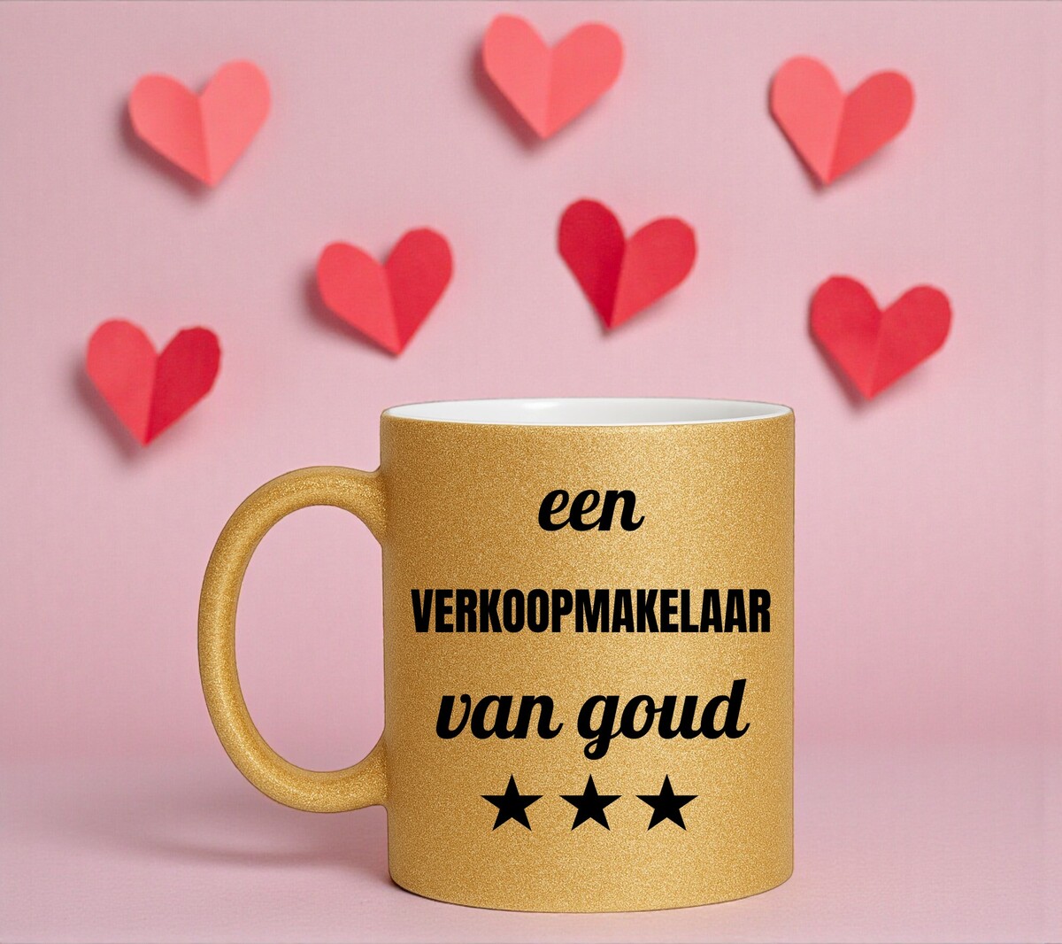 Een prachtig kado voor een verkoopmakelaar van goud! Erg Leuk om de gouden glitter mok cadeau te geven. De mok is gemaakt van wit keramiek en is aan de buitenkant volledig bedekt met gouden glitters.