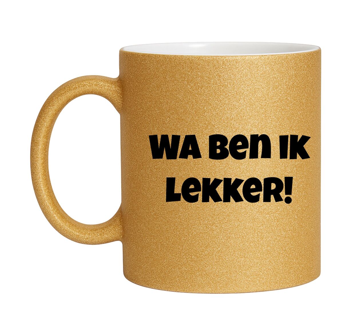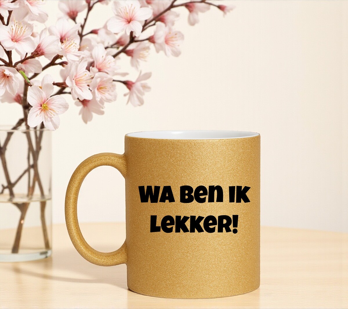 De gouden glittermok heeft een hoogte van 96 mm, een diameter van 80 mm en een inhoud van circa 330 ml. Door de glittercoating is deze mok niet geschikt voor de magnetron en wordt handwas aanbevolen om de opdruk en glans te behouden.