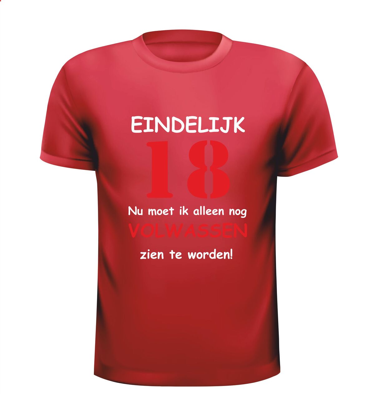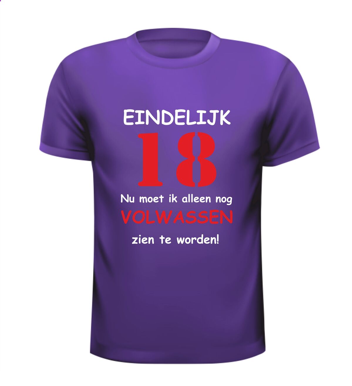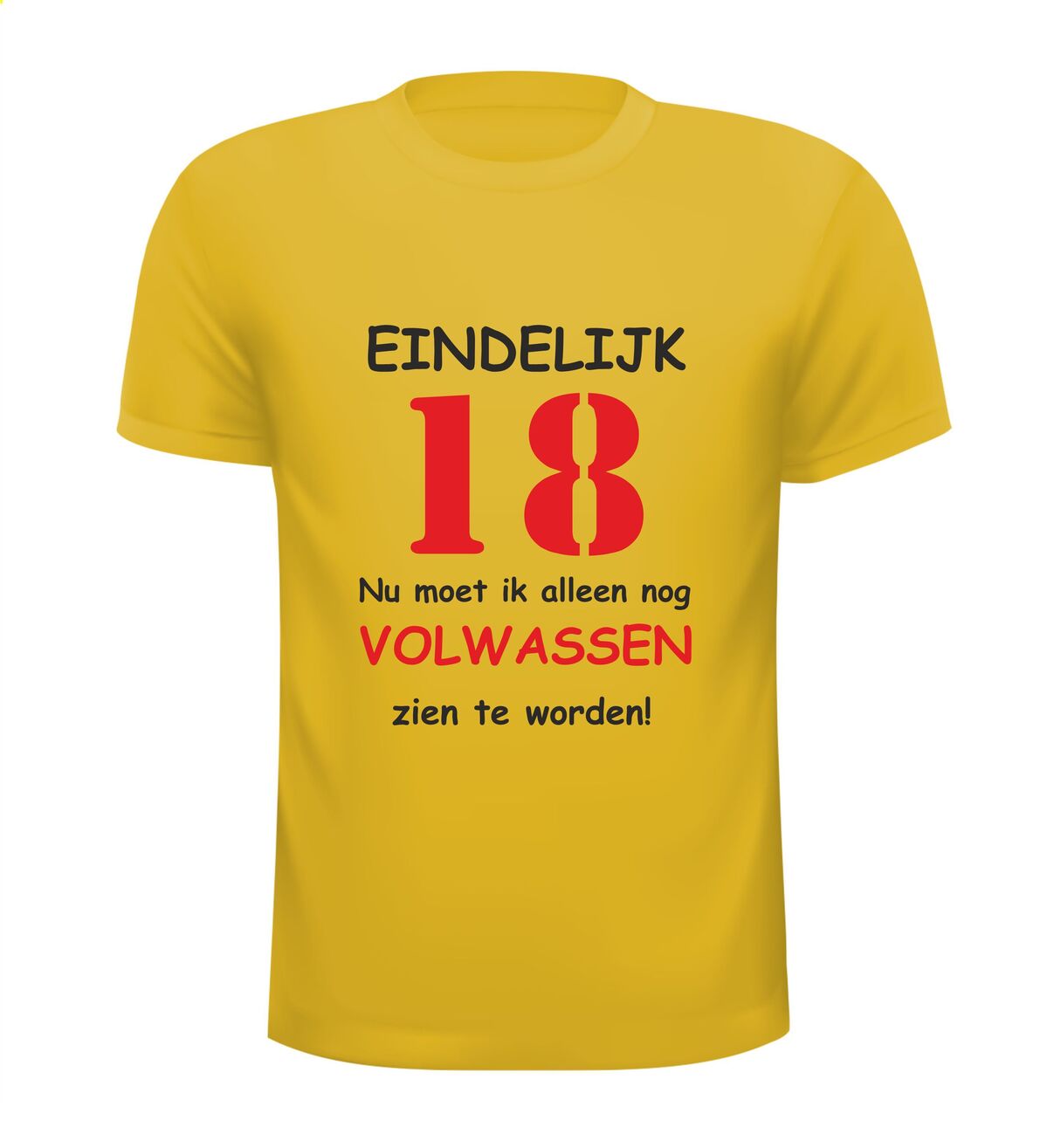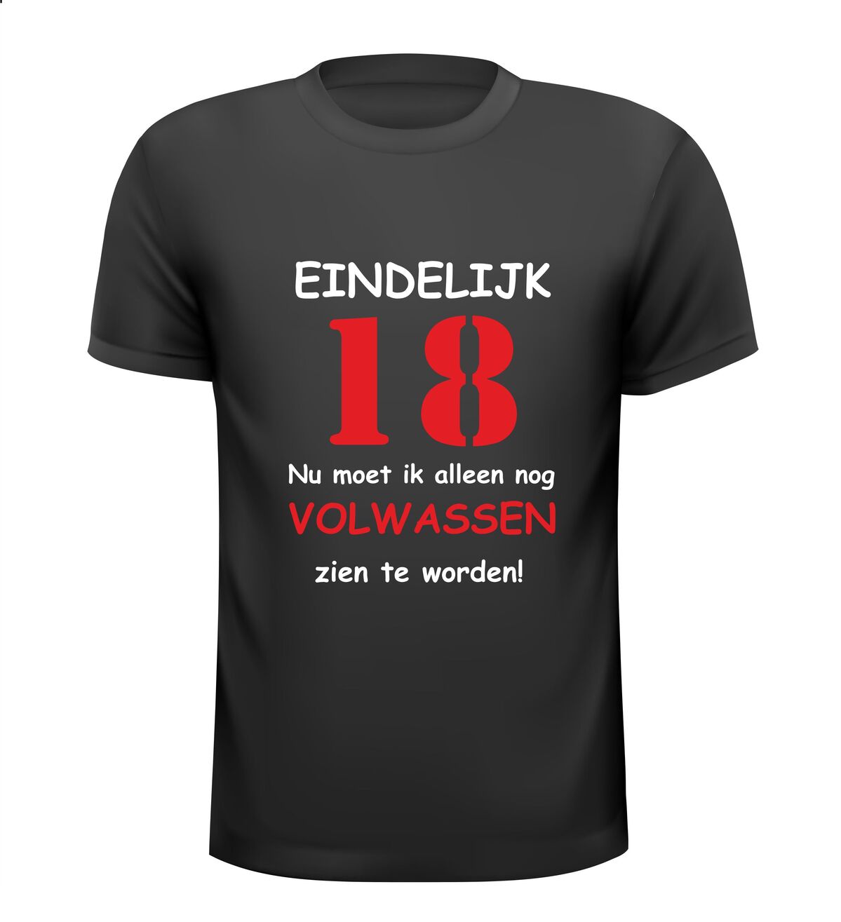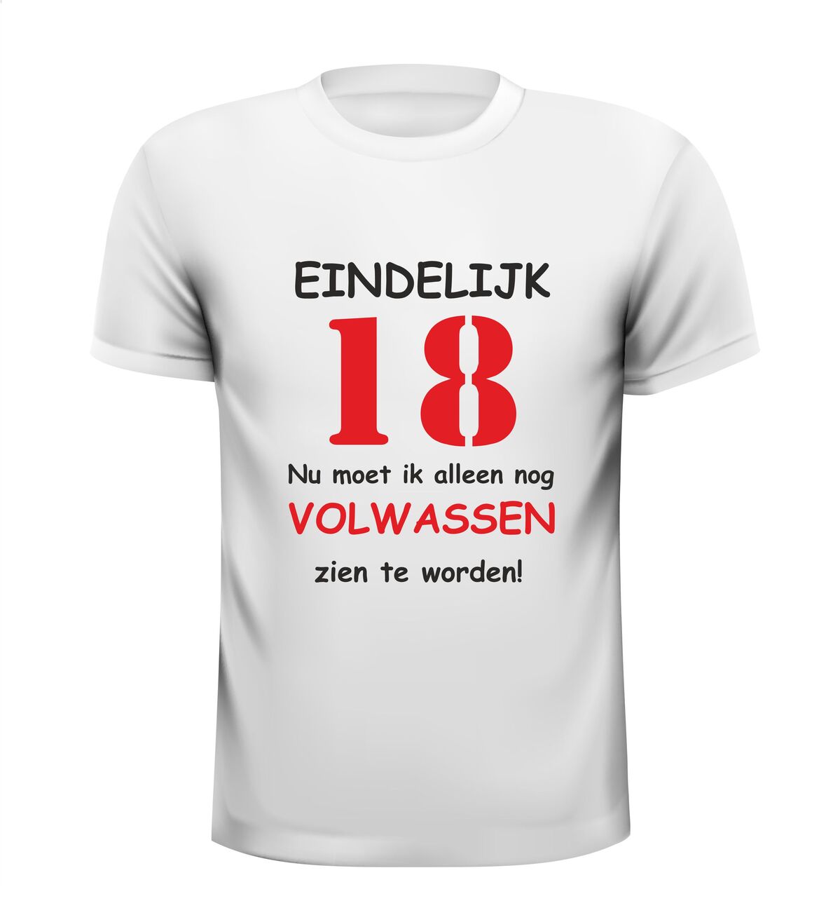 Dit T-shirt met de tekst: Eindelijk 18 jaar, nu moet ik alleen nog volwassen zien te worden, is het perfecte shirt voor een 18e verjaardag met humor. Achttien worden is een grote mijlpaal en met dit grappige 18 jaar T-shirt laat je zien dat volwassen worden misschien nog even mag wachten. Ideaal voor een verjaardagsfeest, examenfeest of als opvallend outfit op de grote dag.