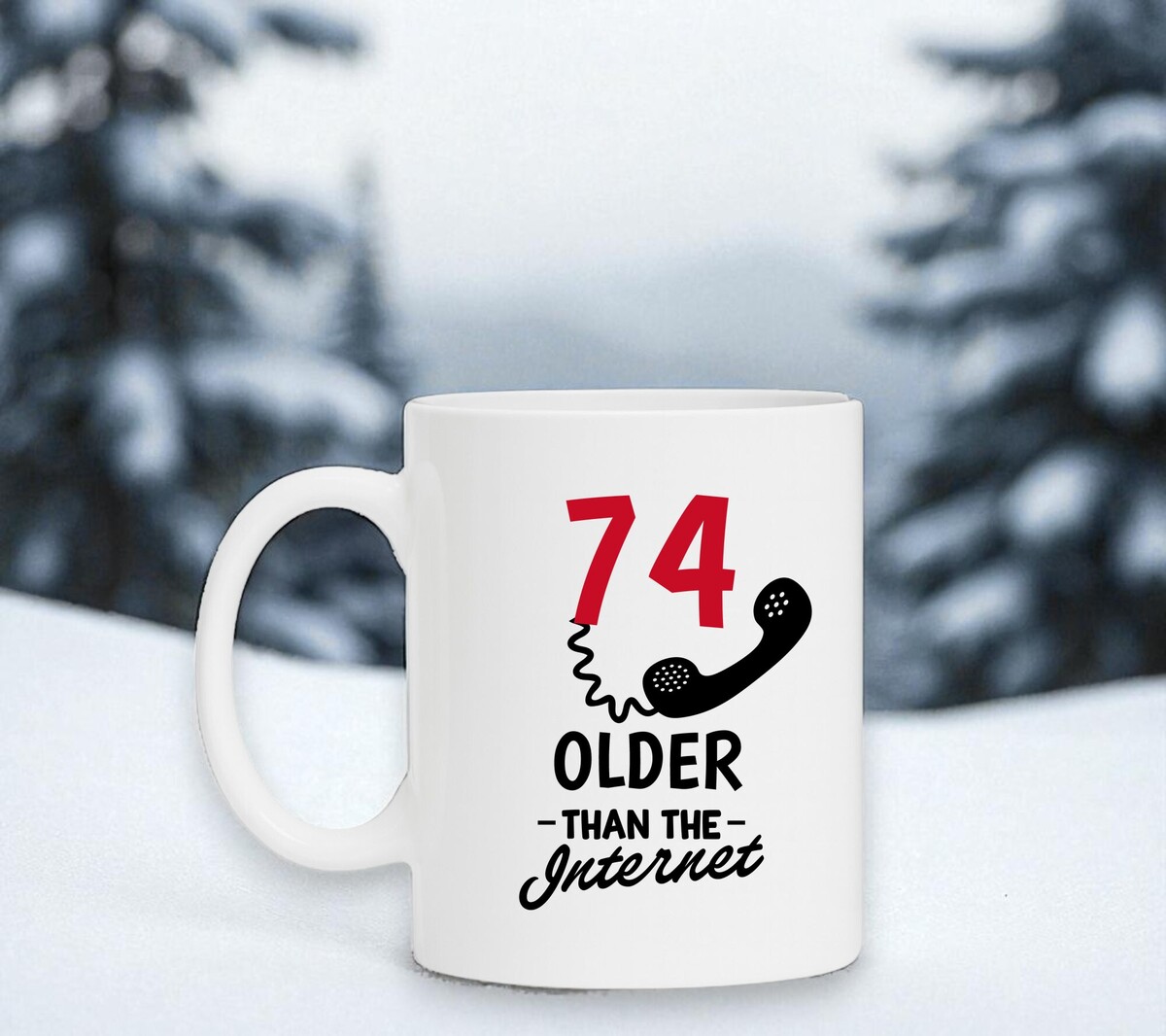 Prachtige grappige koffie of thee mok voorzien van een grappige opdruk. Op de mok staan grote rode cijfers met de leeftijd 74 daaronder staat de opdruk 'older than the internet' De witte koffie of thee mok is vaatwasserbestendig en magnetronbestendig. De mok heeft een hoogte van 96mm en een diameter van 80mm.