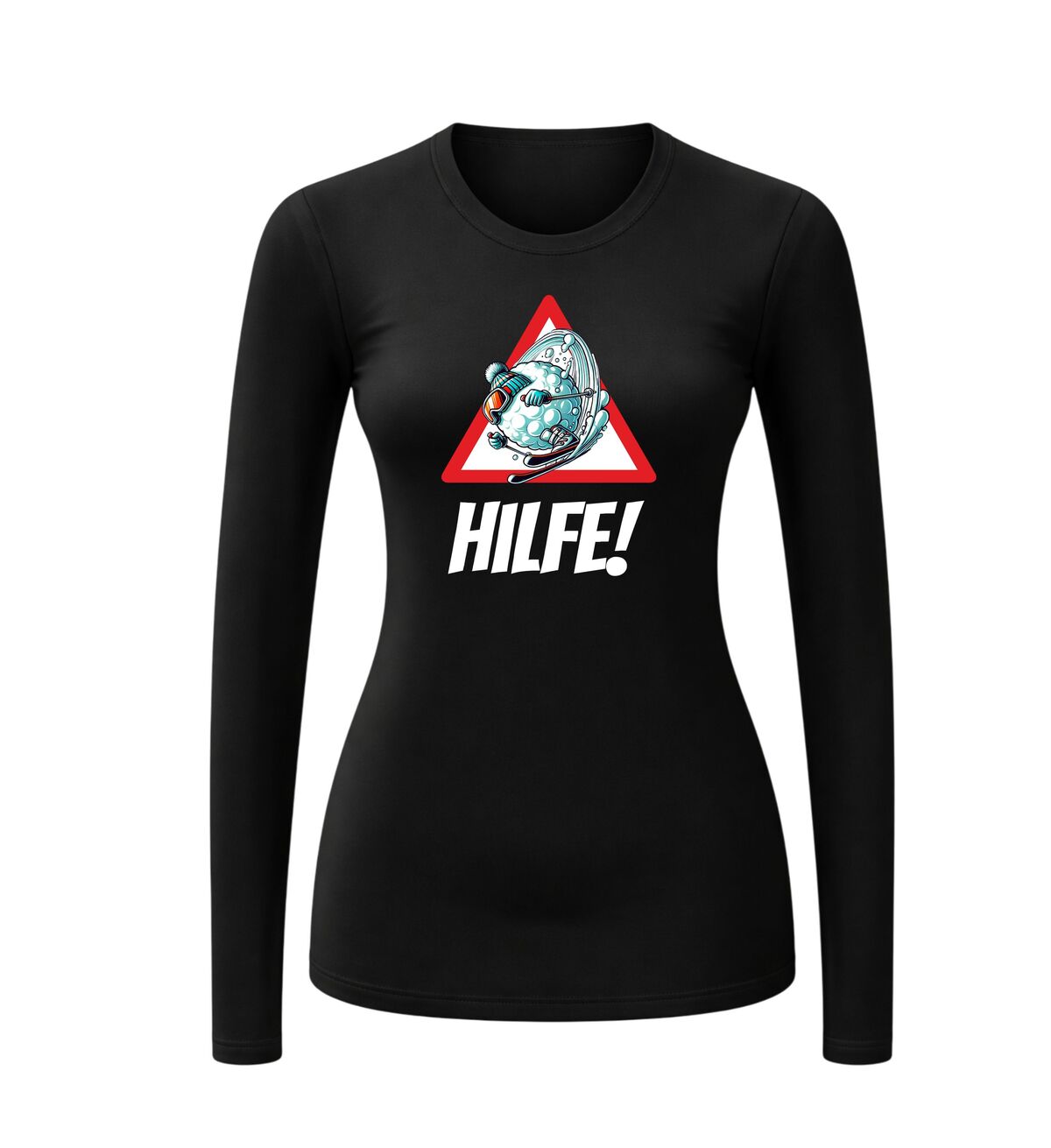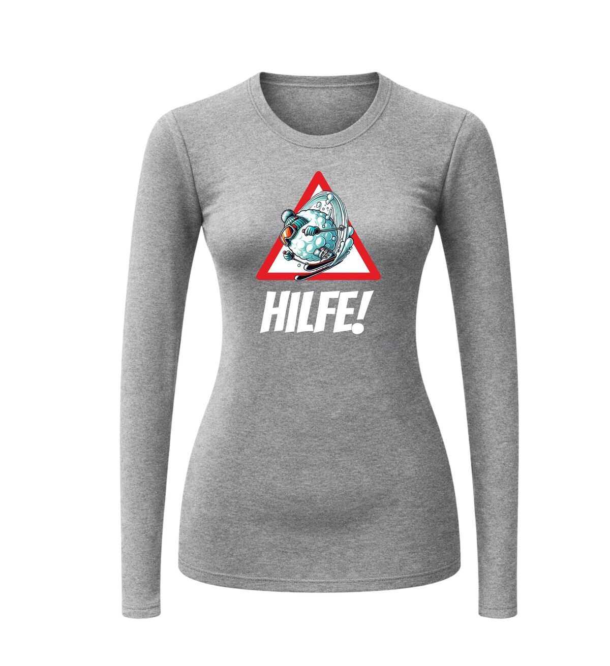 Super vet Apres ski T-shirt lange mouw. Voorzien van de Duitse tekst “Hilfe” en hulp heeft deze skier wel nodig hij gaat met een rot gang naar beneden!