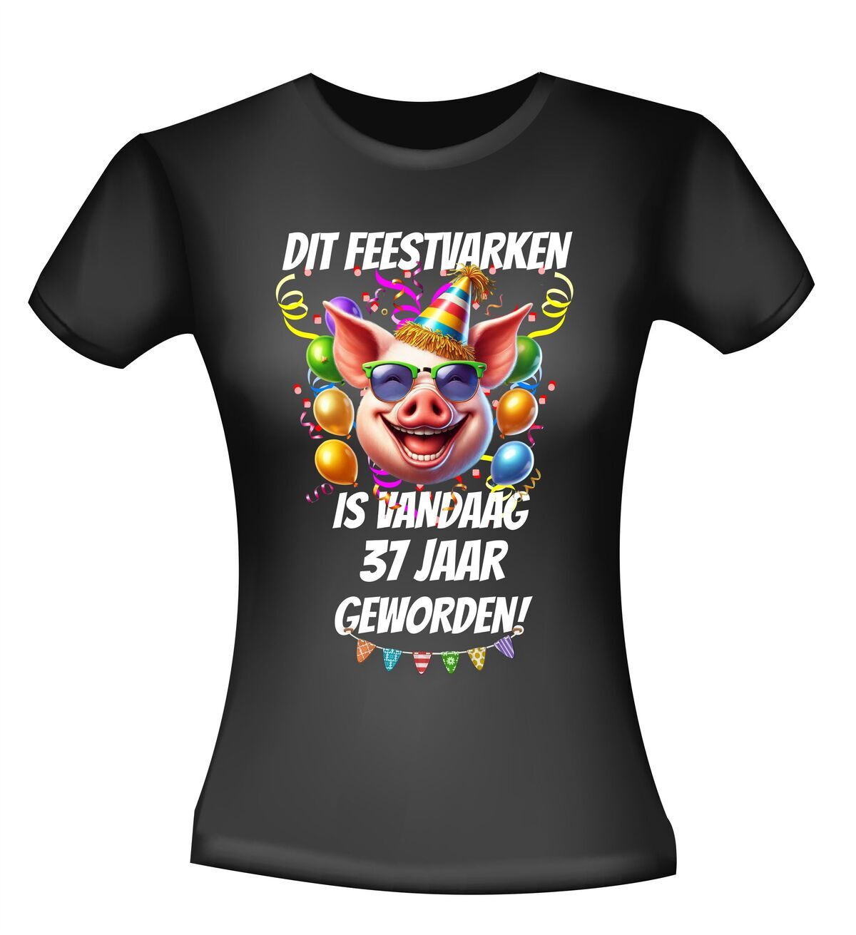 Leuk fun shirt voor een jarig feestvarken. Dit mooie full colour shirt waar de tekst op staat: Dit feestvarken is vandaag 37 jaar geworden is erg leuk om cadeau te doen tijdens een 37e verjaardag.