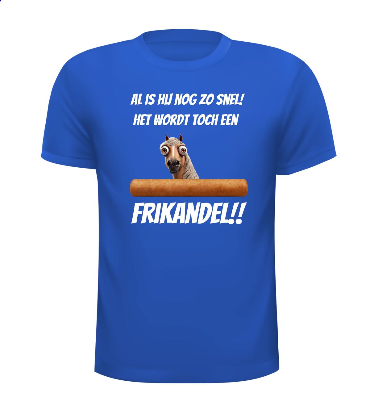 Dit is weer een van onze vele t-shirt met een dikke vette knipoog. De tekst op het t-shirt: al is hij nog zo snel het wordt toch een frikandel! Voorzien van een print van een cartoon paard en een frikandel. Dit is een van de vele gekke t-shirt uit onze collectie. Kijk rustig rond en vind jouw leuk grappige of gekke t-shirt! Zit jouw t-shirt er niet bij of wil je net iets anders? Geen nood ontwerp dan je eigen t-shirt met onze ontwerp module. Zo slaag je altijd bij ons!