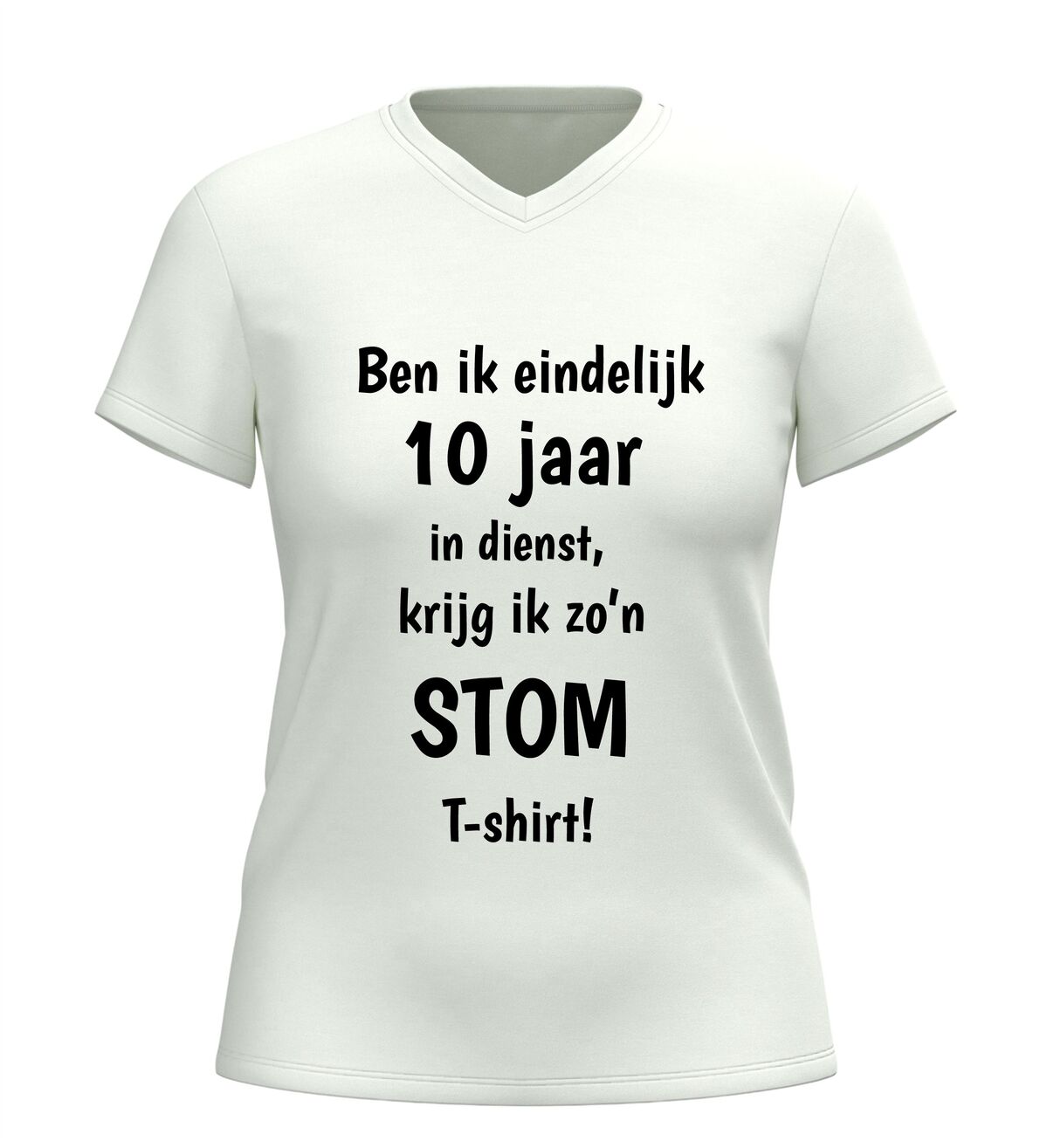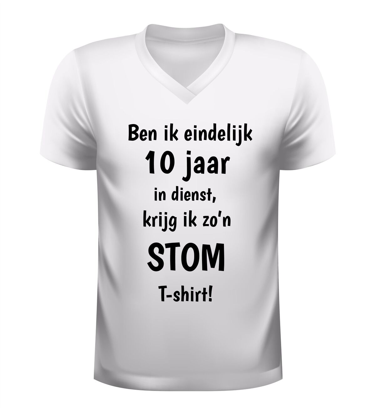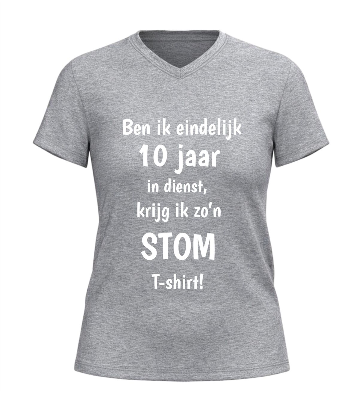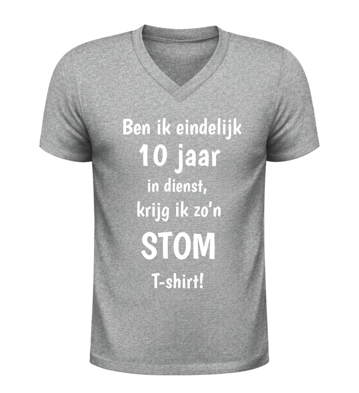 Dit V-hals T-shirt met de tekst: Ben ik eindelijk 10 jaar in dienst krijg ik zo’n stom shirt is hét perfecte bewijs dat een werkjubileum ook met humor gevierd mag worden. Tien jaar trouwe dienst is een mijlpaal, en dit shirt zet die prestatie op een luchtige en herkenbare manier in de spotlight. Ideaal voor collega’s die zichzelf niet al te serieus nemen en graag een glimlach op de werkvloer brengen.