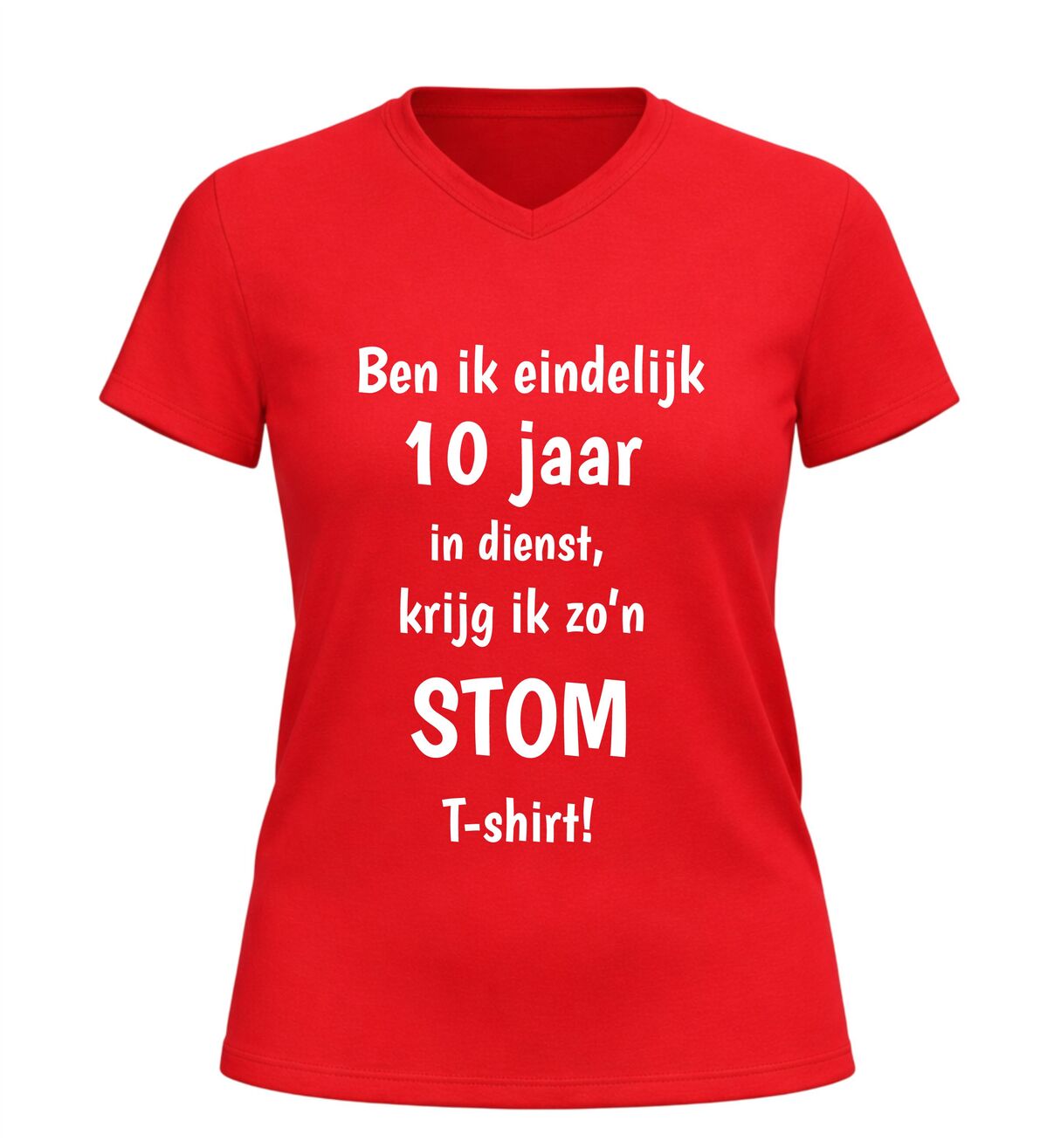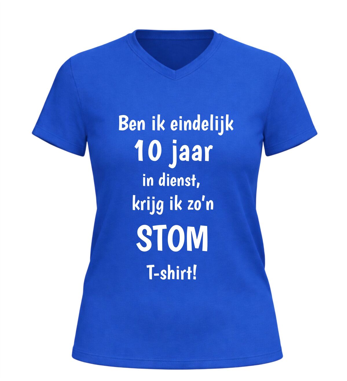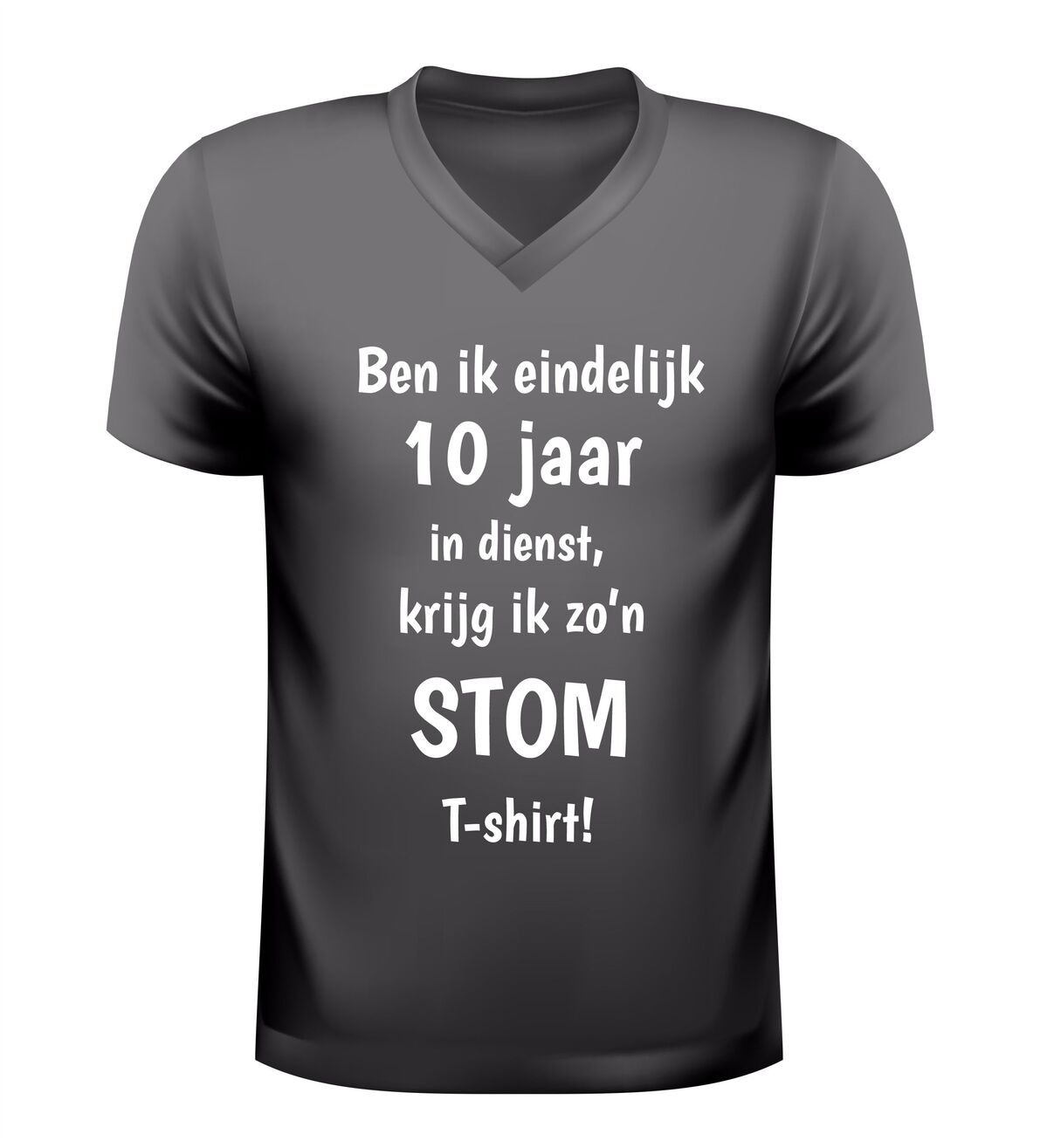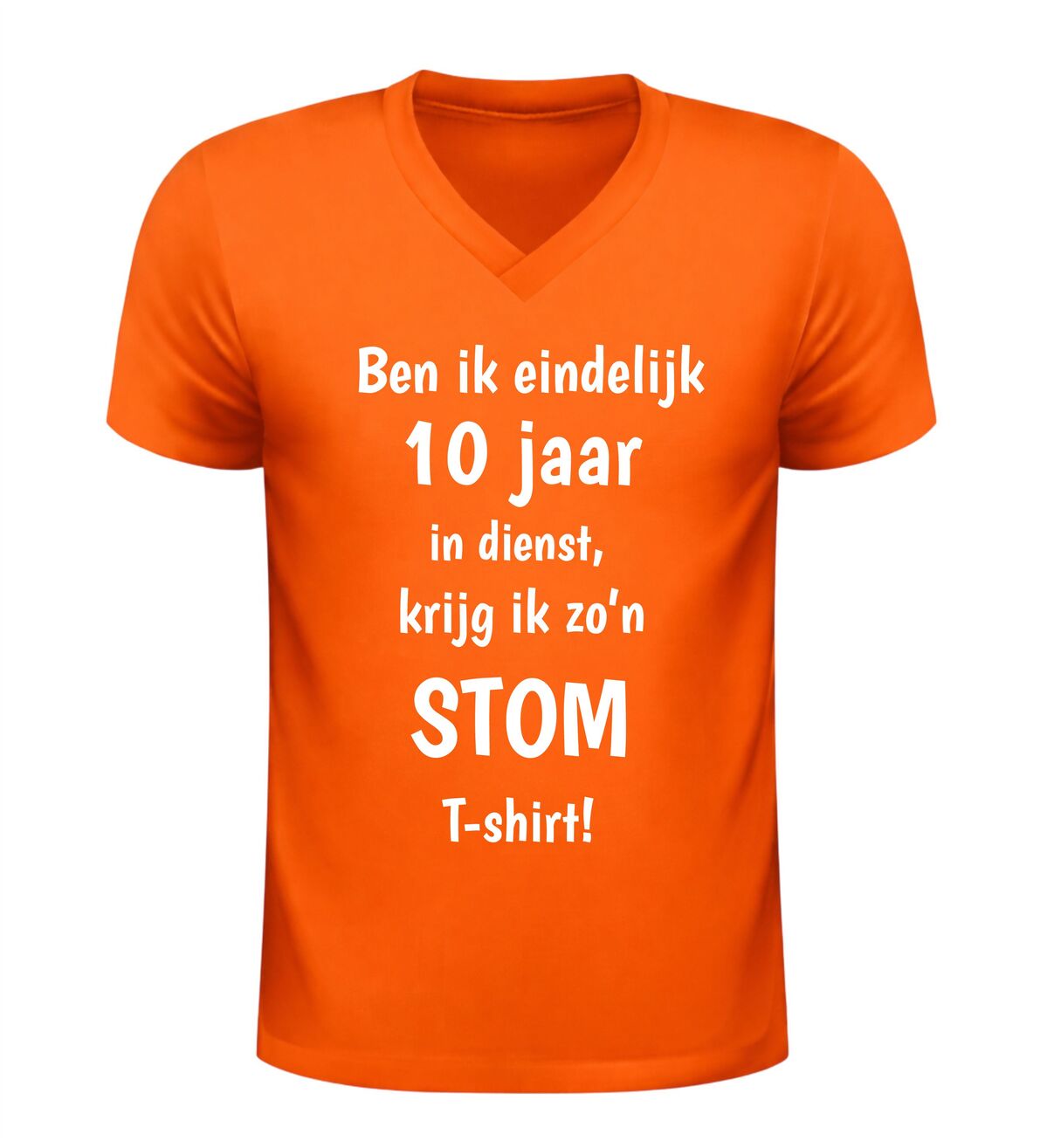 Dit V-hals T-shirt met de tekst: Ben ik eindelijk 10 jaar in dienst krijg ik zo’n stom shirt is hét perfecte bewijs dat een werkjubileum ook met humor gevierd mag worden. Tien jaar trouwe dienst is een mijlpaal, en dit shirt zet die prestatie op een luchtige en herkenbare manier in de spotlight. Ideaal voor collega’s die zichzelf niet al te serieus nemen en graag een glimlach op de werkvloer brengen.