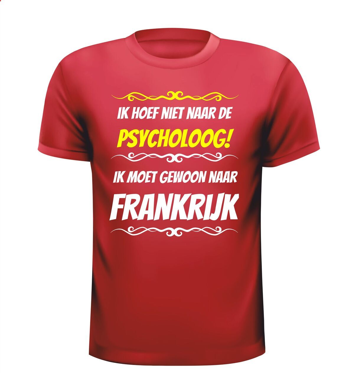 Naar een jaar hard werken ben je echt toe aan je wel verdiende vakantie naar Frankrijk! Even leven als een god in Frankrijk! Je bent vast niet de enige Nederlander die naar Frankrijk op vakantie gaat! Hoe grappig is het dan niet om een T-shirt met een geweldige spreuk te dragen. Dit T-shirt met de tekst ‘ik hoef niet naar de psycholoog ik moet gewoon naar Frankrijk is er zo eentje!