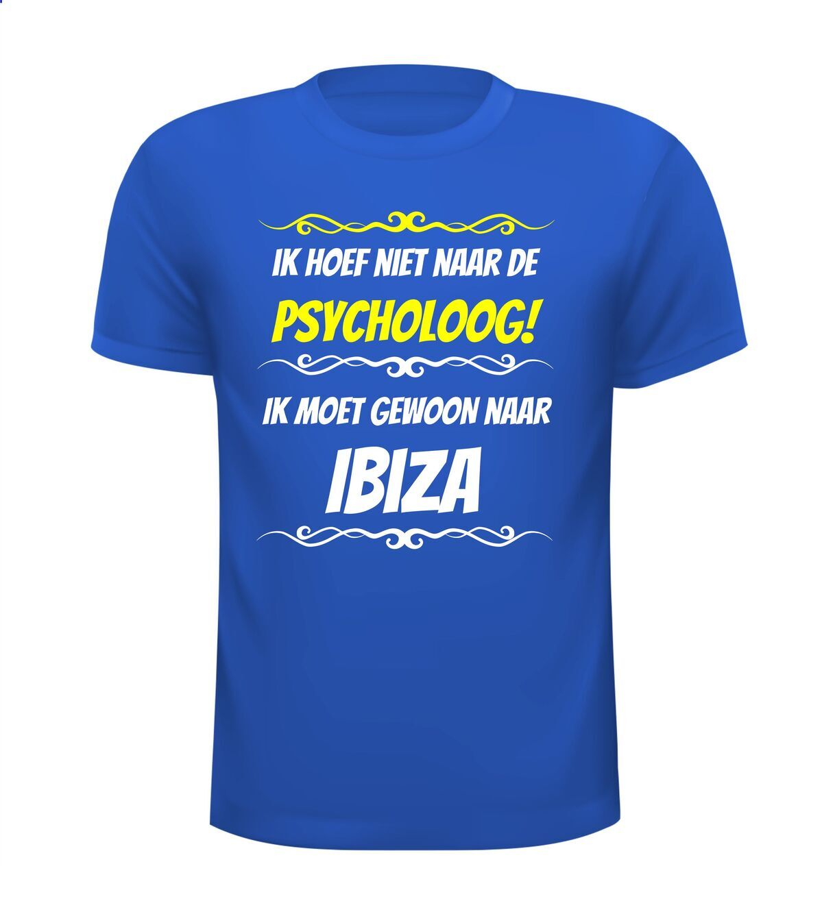 Heerlijk op vakantie naar Ibiza. Je zal niet de enige zijn en je zal er vele Nederlanders treffen. Hoe leuk is het dan niet om een T-shirt te dragen met een gekke en grappige tekst zoals op dit T-shirt staat geschreven ‘ik hoef niet naar de psycholoog ik moet gewoon naar Ibiza erg leuk om tijdens jouw vakantie te dragen! ‘