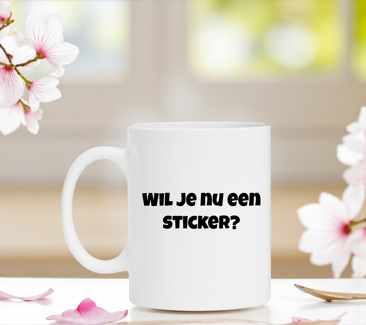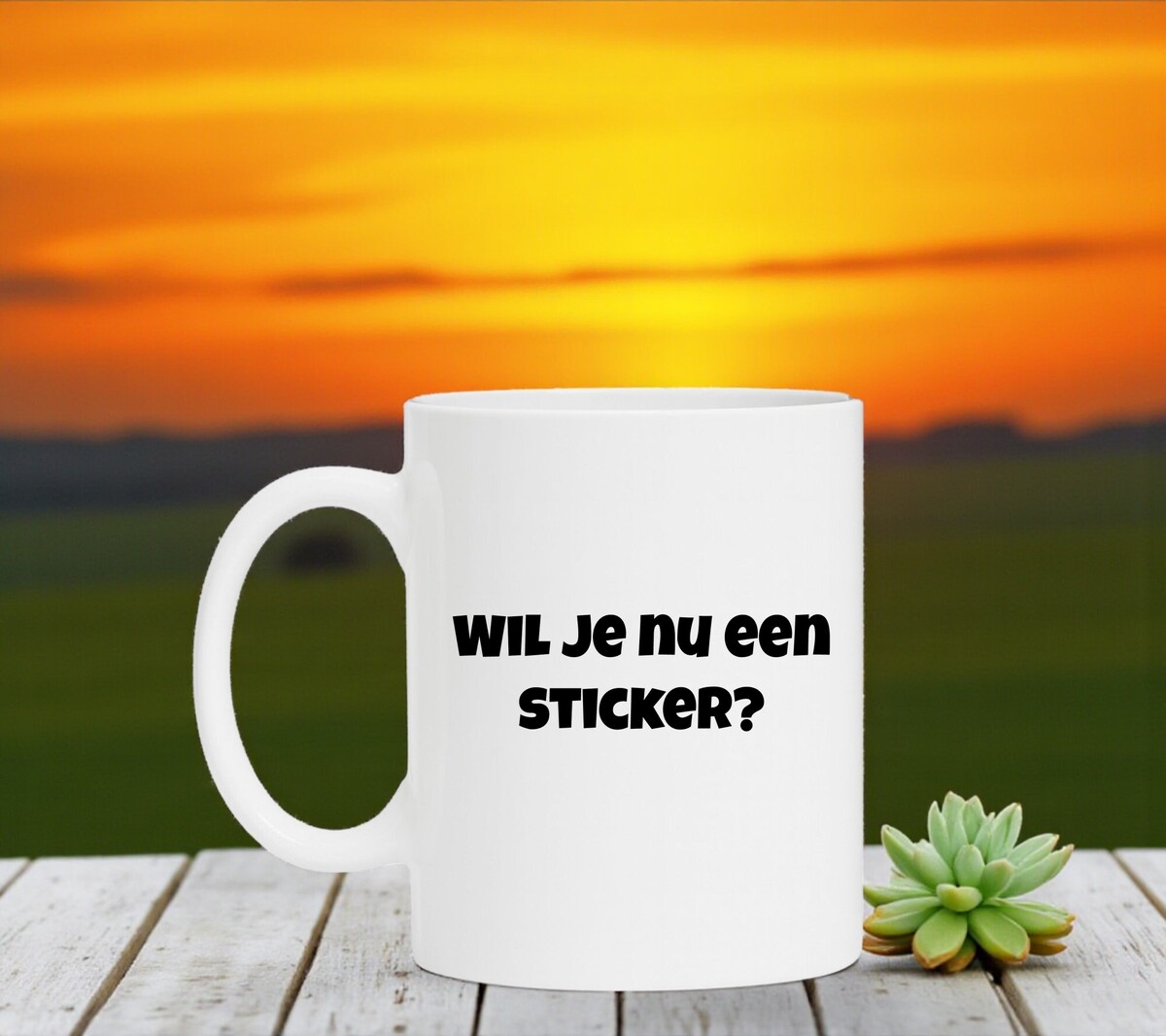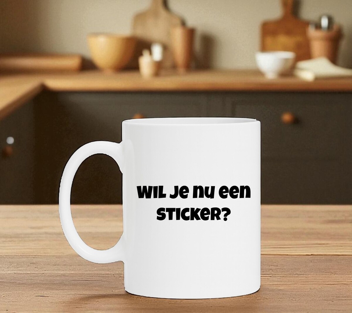 Grappige koffiemok voor op je werk bijvoorbeeld. Met een grappige opdruk Wil je nu een sticker?