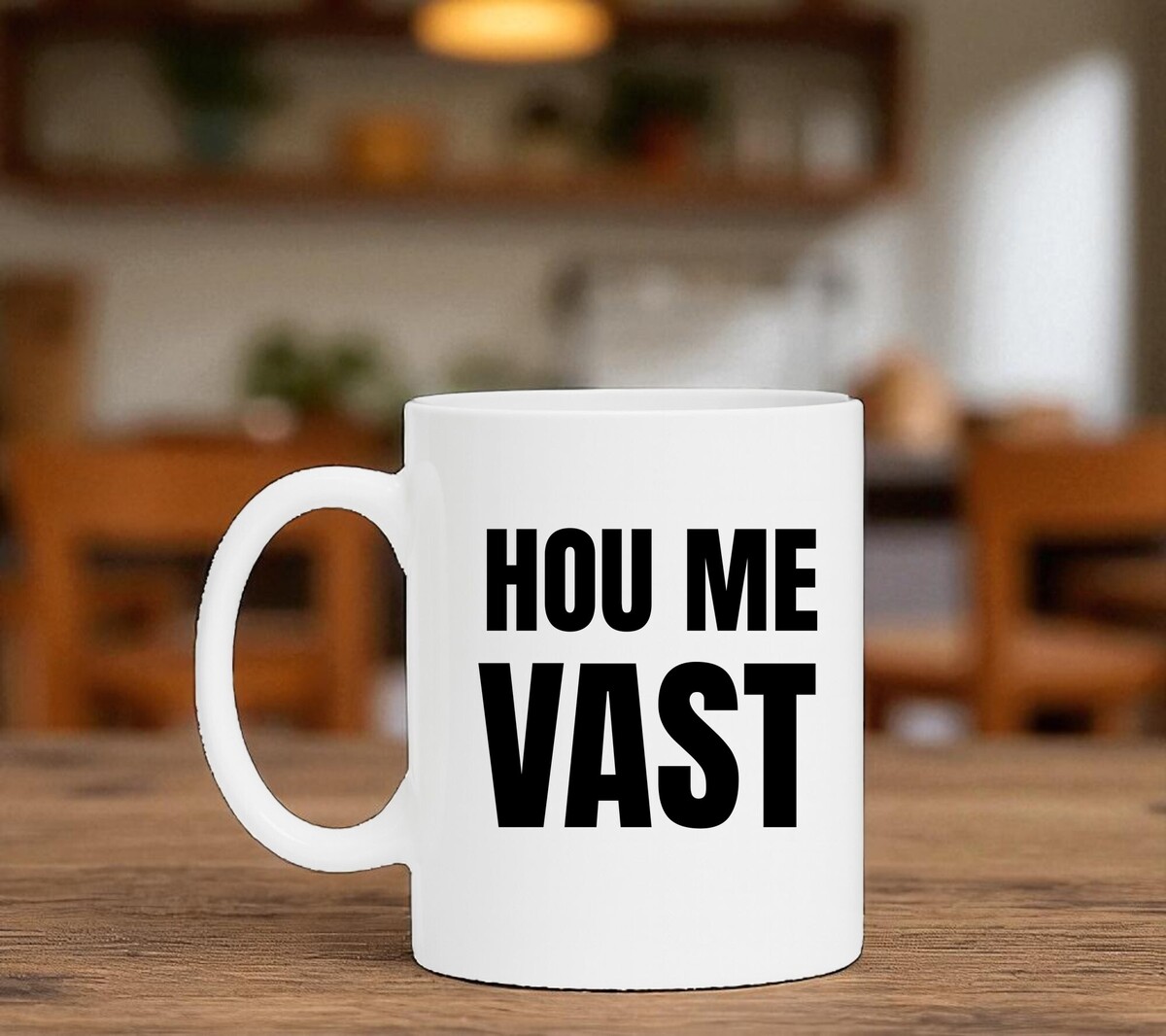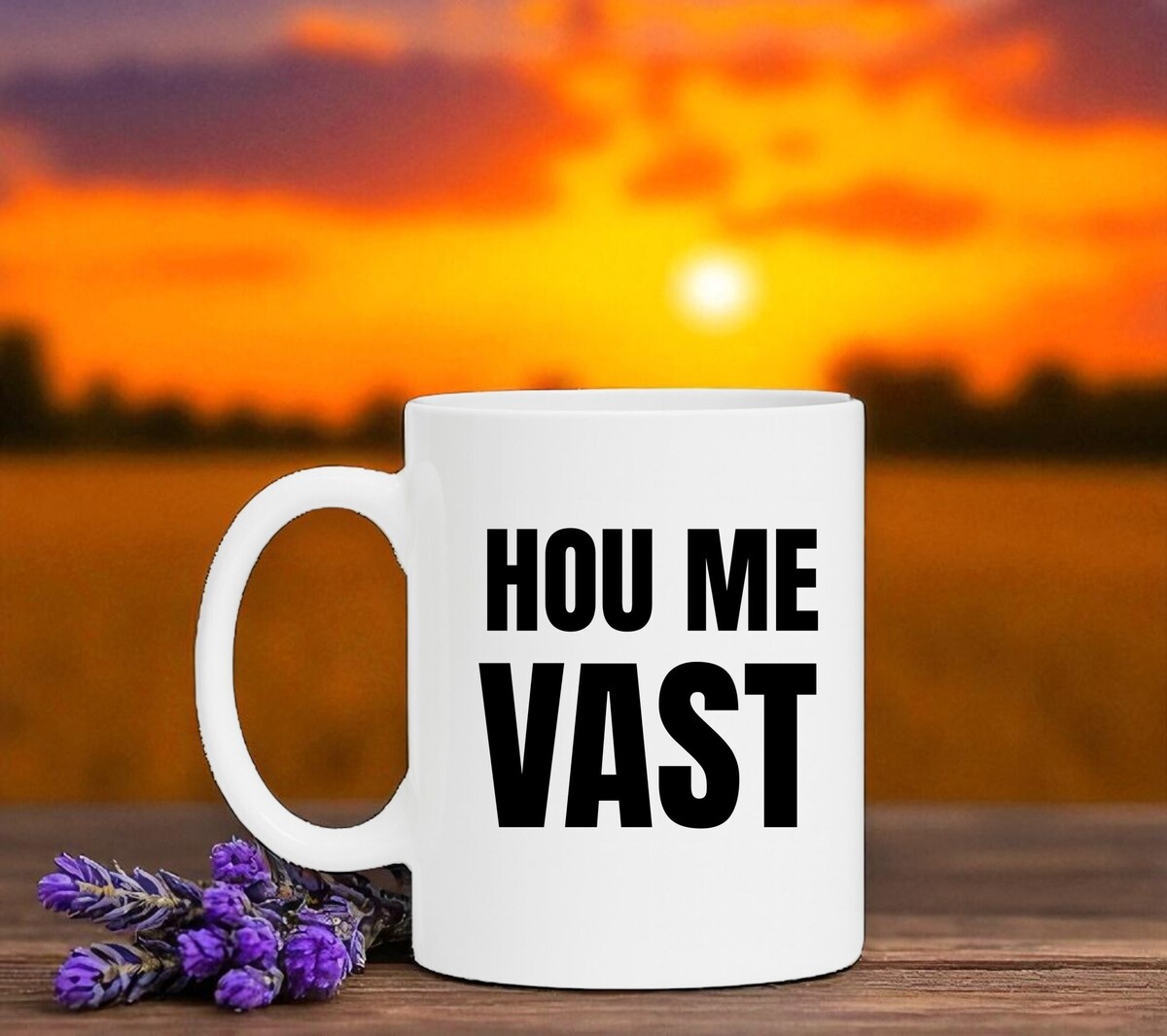 Grappige koffie of thee mok met de opdruk in grote zwarte letters Hou me vast. De mok is magnetron en vaatwasserbestendig en de witte mok heeft een hoogte van 96mm en een diameter van 80mm.
