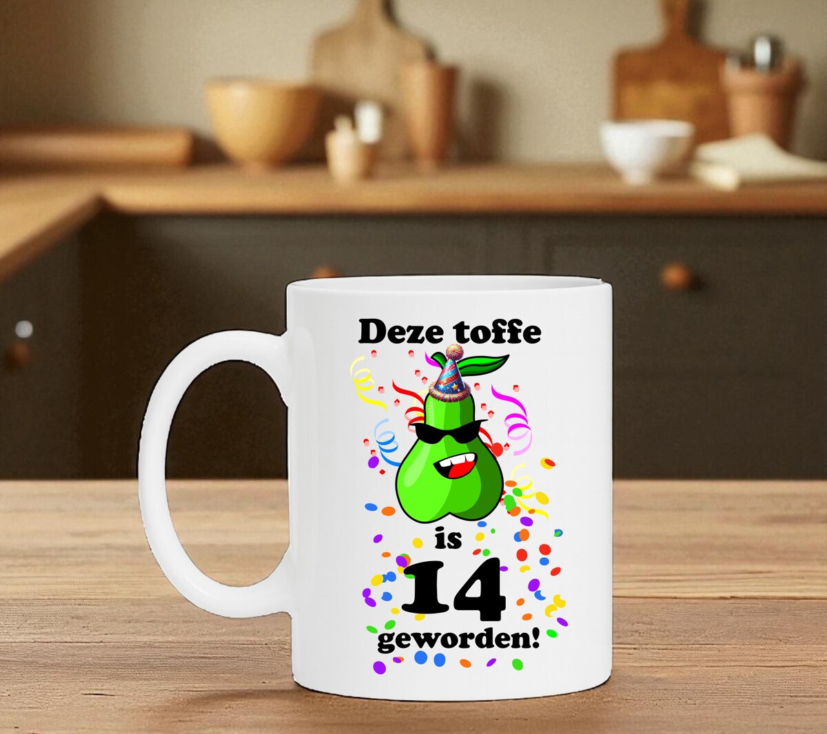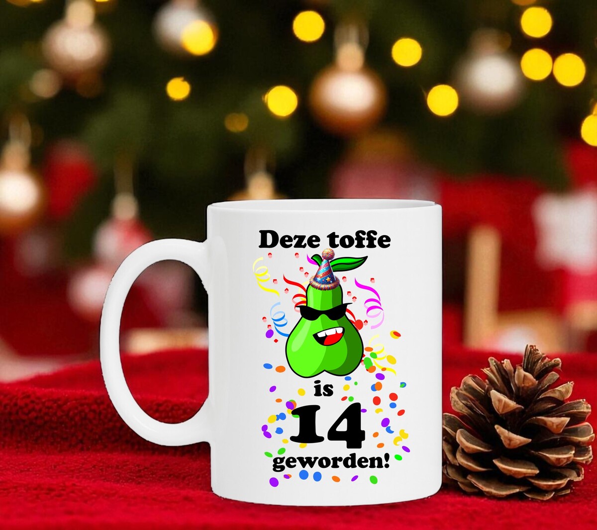 Deze mok met leuke tekst en print van een toffe peer is een erg leuk cadeau voor een 14e verjaardag. Deze toffe peer is 14 geworden.